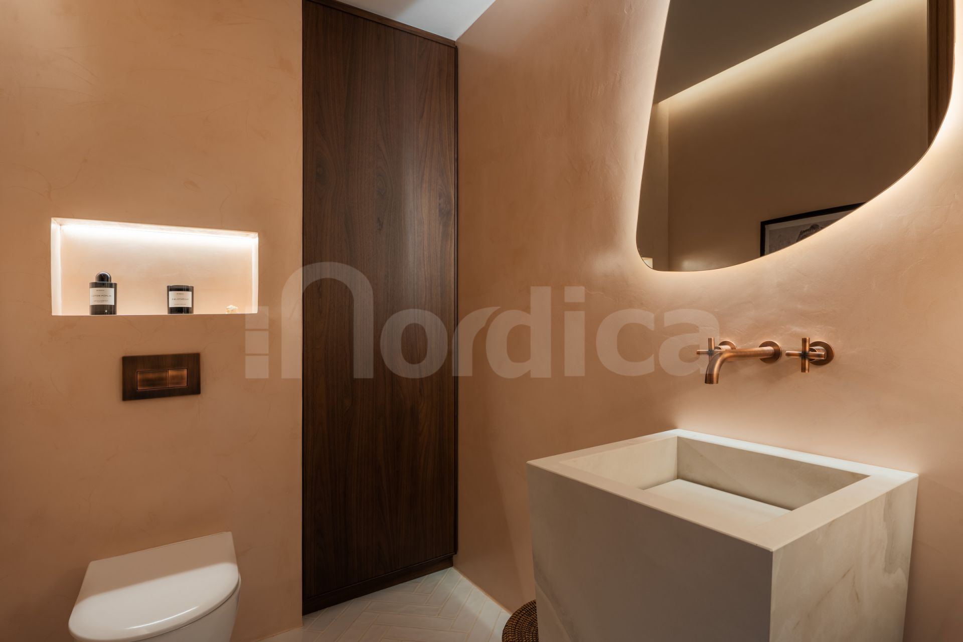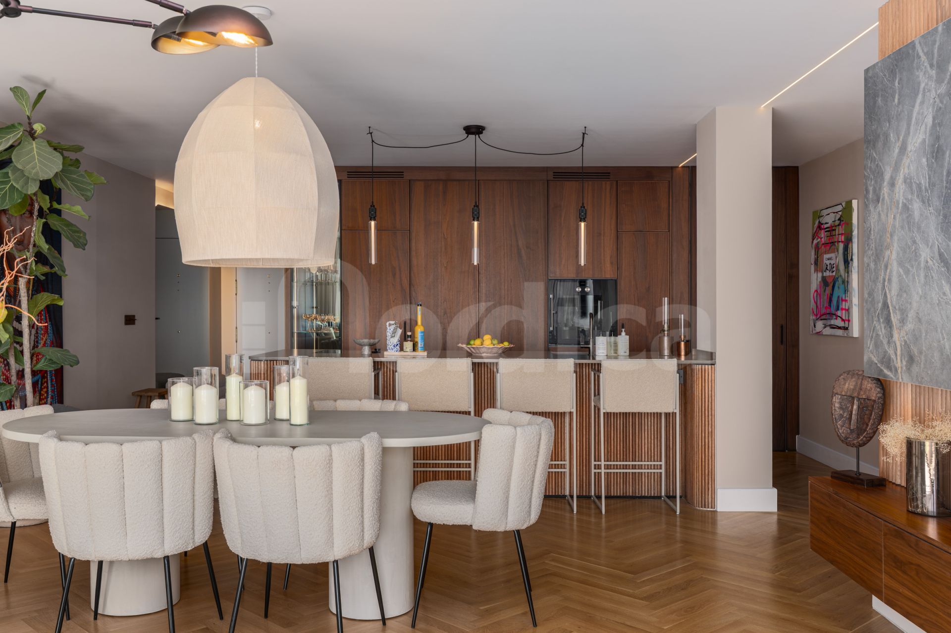 A custom-built kitchen serves as a focal point of the home, crafted in warm walnut wood and fitted with Gaggenau and Smeg appliances.