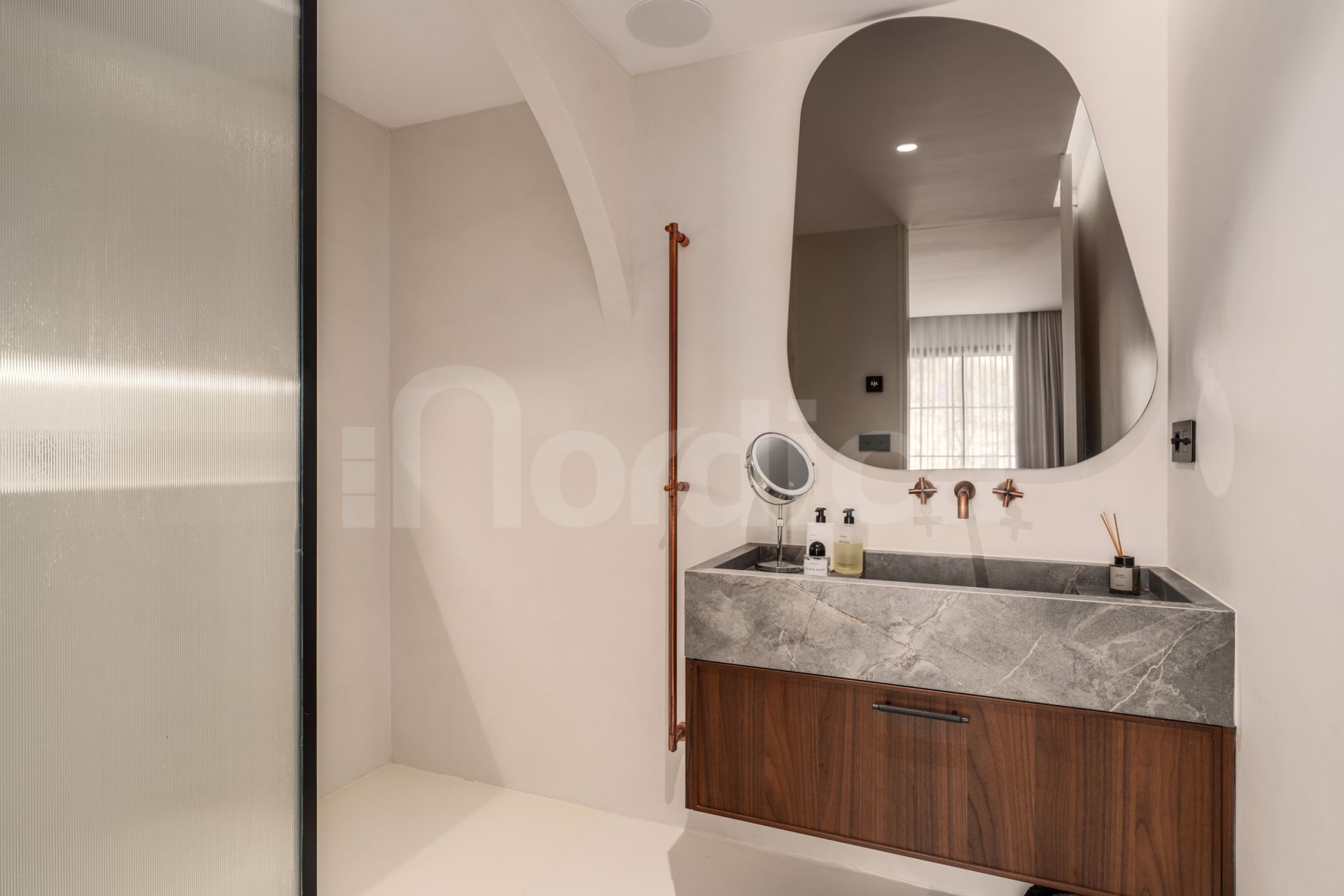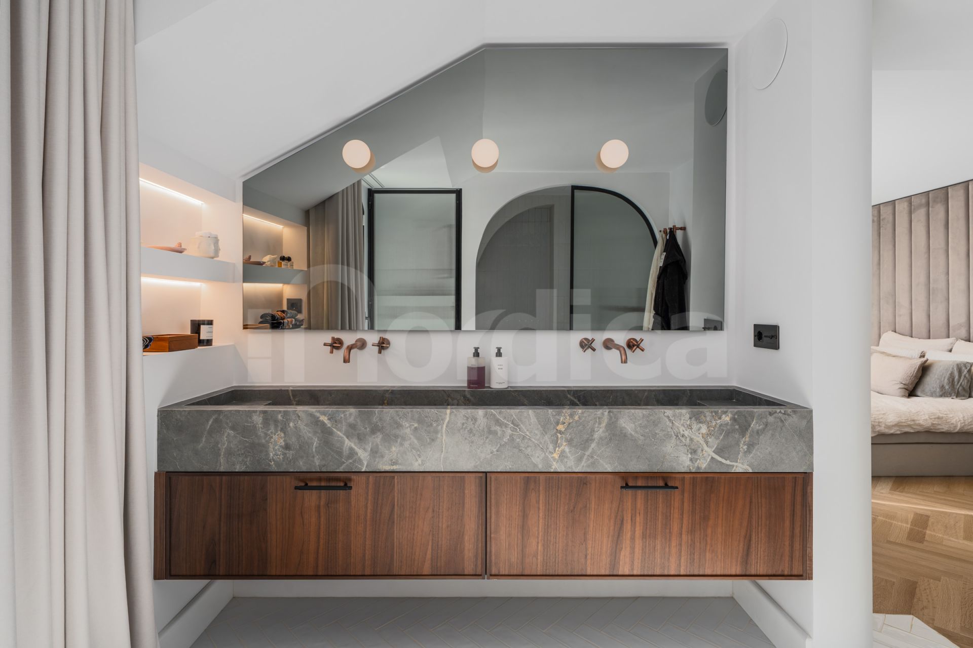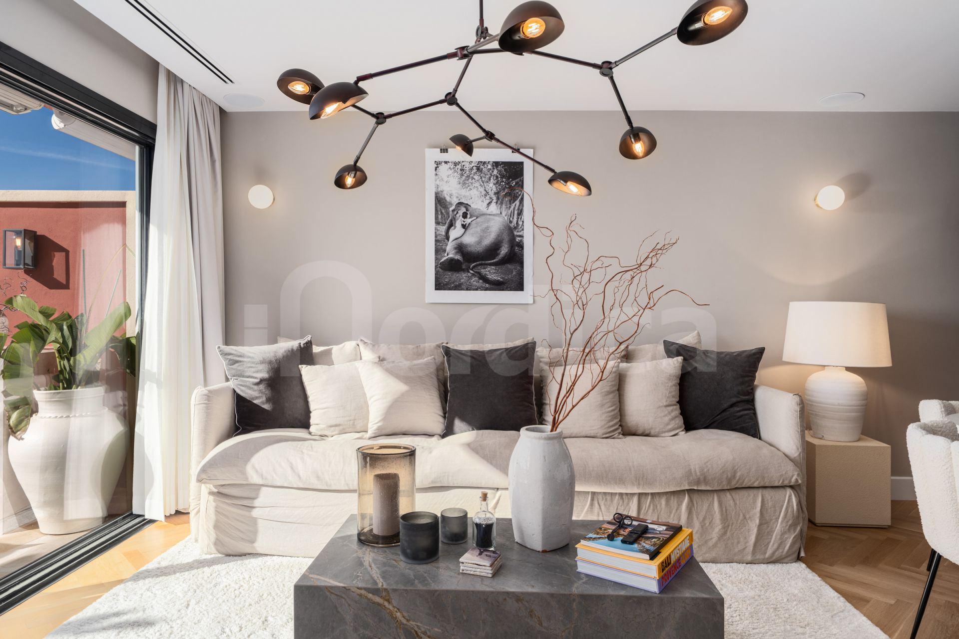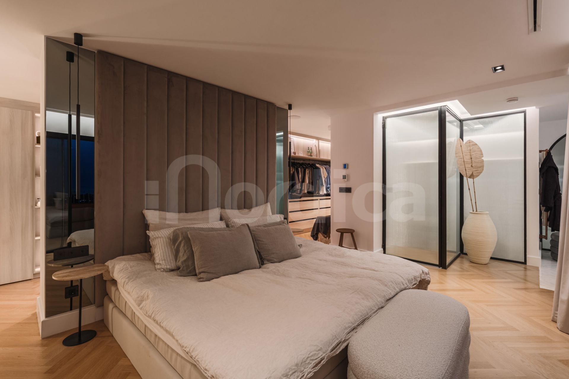 The master suite is particularly impressive, offering 16 meters of custom wardrobe space, a Swedish hotel-grade bed measuring 210 cm, and a luxurious en-suite bathroom with a double hand shower and oversized rain shower. A hidden office and an additional 20-square-meter storage space provide practicality without compromising the aesthetics of the living space. The apartment features underfloor heating in all bathrooms as well as a zoned Airzone climate control system for ultimate comfort.