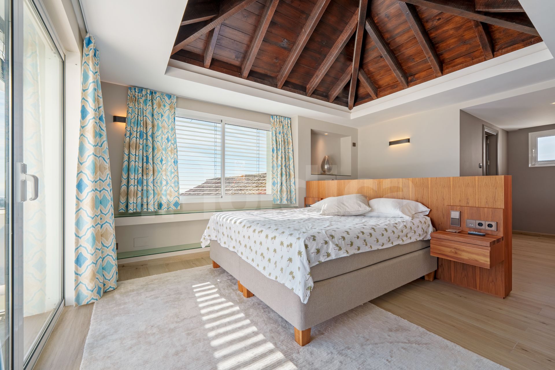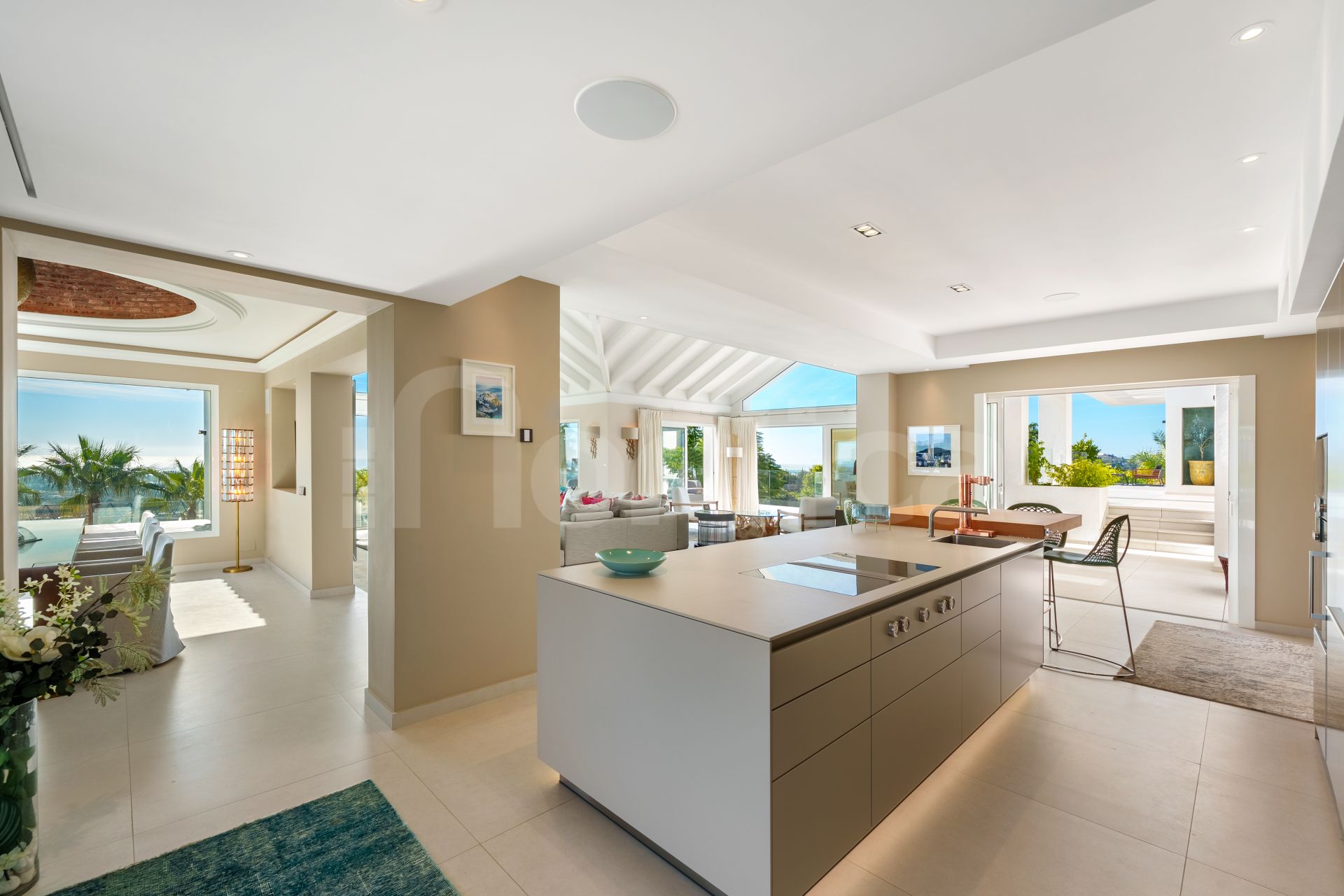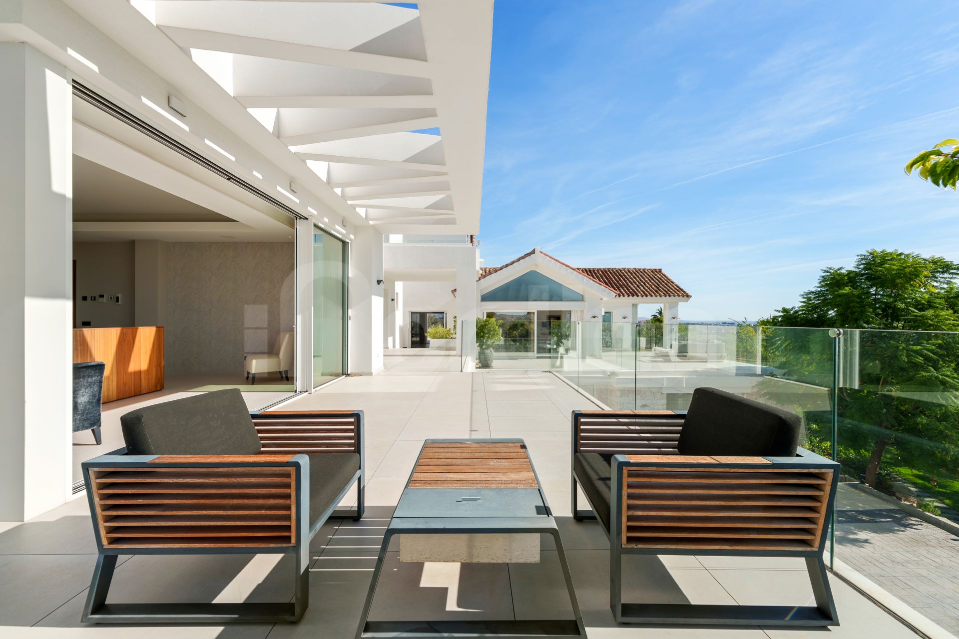 The villa enjoys a privileged hillside setting that enhances natural light, openness, and far-reaching views. Its contemporary Mediterranean architecture is defined by generous interior volumes, extensive glazing, and a seamless connection between indoor living areas and outdoor terraces. Access is private and discreet, with a driveway that accommodates up to eighteen vehicles. The independent guest house provides an ideal solution for hosting visitors or extended family while maintaining privacy within the main home.