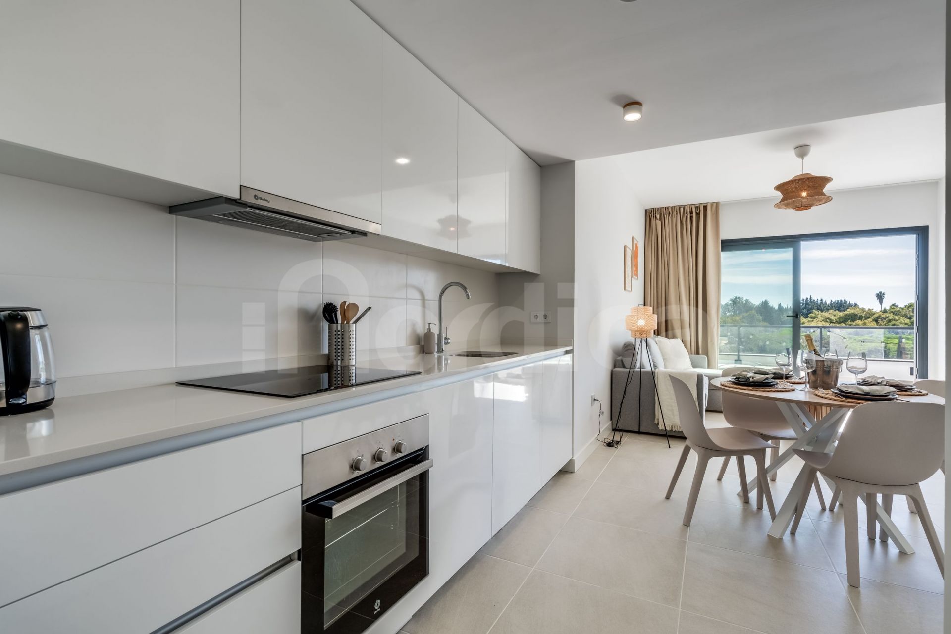 The apartment features a bright living and dining area with an open-plan, fully fitted kitchen equipped with Bosch appliances. The spacious bedroom includes an en-suite bathroom, and the interior flows seamlessly onto a generous private terrace—perfect for relaxing or entertaining outdoors.
