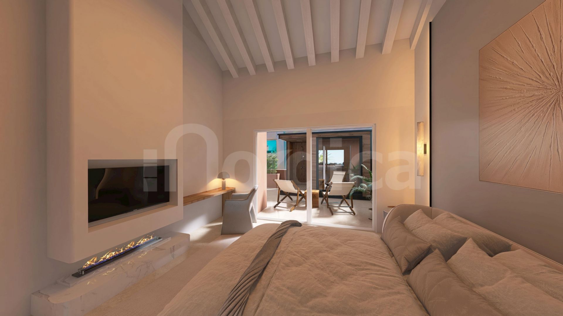Luxury touches such as a Bang & Olufsen sound system, an elegant electric fireplace, and high-end Kettal outdoor furniture elevate the home’s sophisticated ambiance. The private rooftop terrace is an oasis of relaxation, complete with a jacuzzi and sauna, providing breathtaking views and total tranquility.