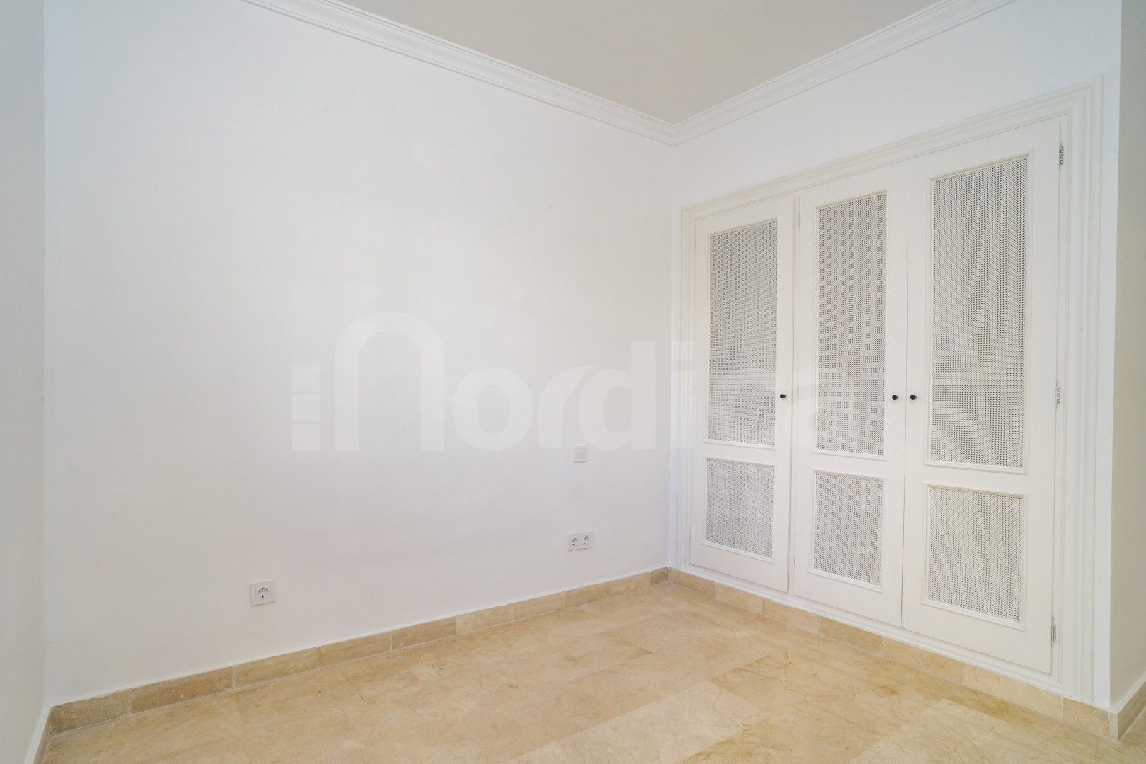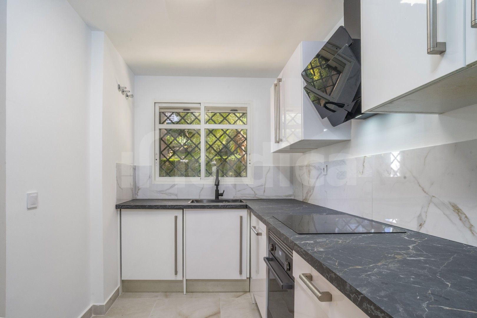 El apartamento ha sido recientemente renovado y presenta un diseño moderno de concepto abierto, combinando las áreas de salón y comedor con una cocina contemporánea totalmente integrada. El espacio interior es luminoso y funcional, con acceso directo a una terraza cubierta y un jardín privado, ideal para disfrutar de la vida al aire libre durante todo el año en Aloha Gardens, Nueva Andalucía.