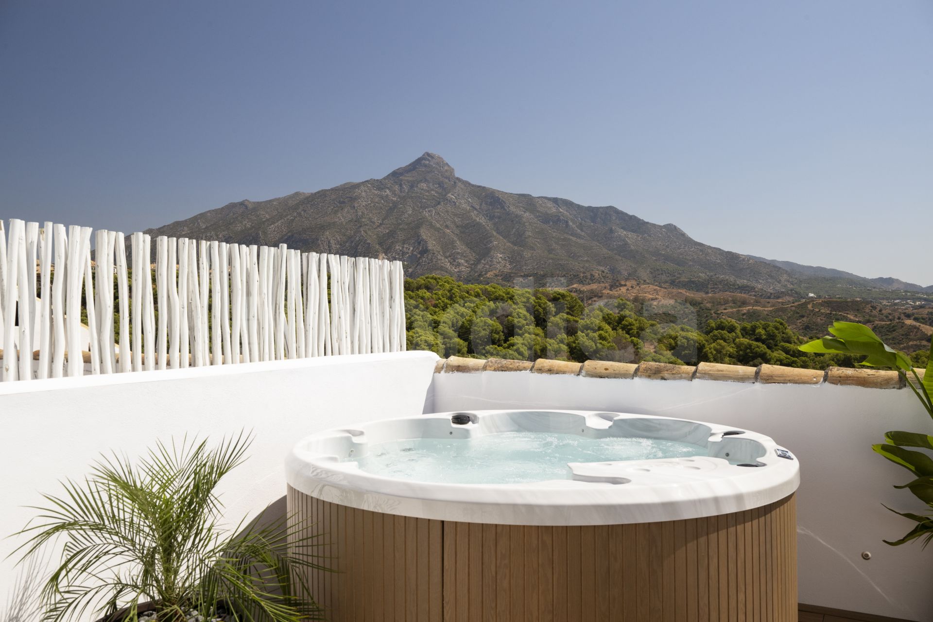 Las zonas de estar abiertas se conectan perfectamente con una amplia terraza, el lugar ideal para reuniones o simplemente para disfrutar de las impresionantes vistas a la montaña de La Concha. Un jacuzzi privado añade un toque de lujo.