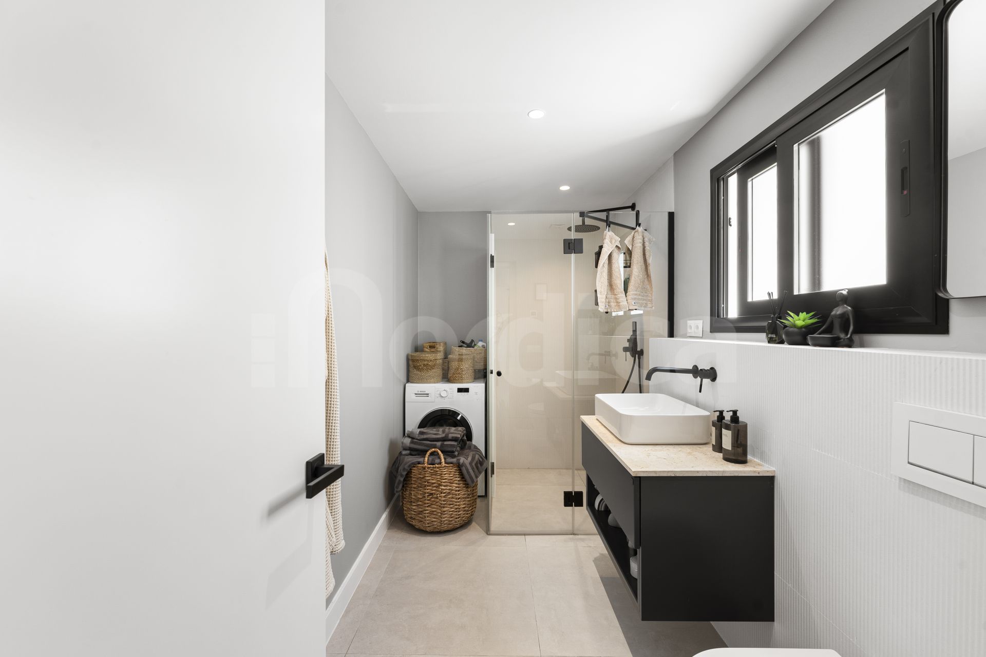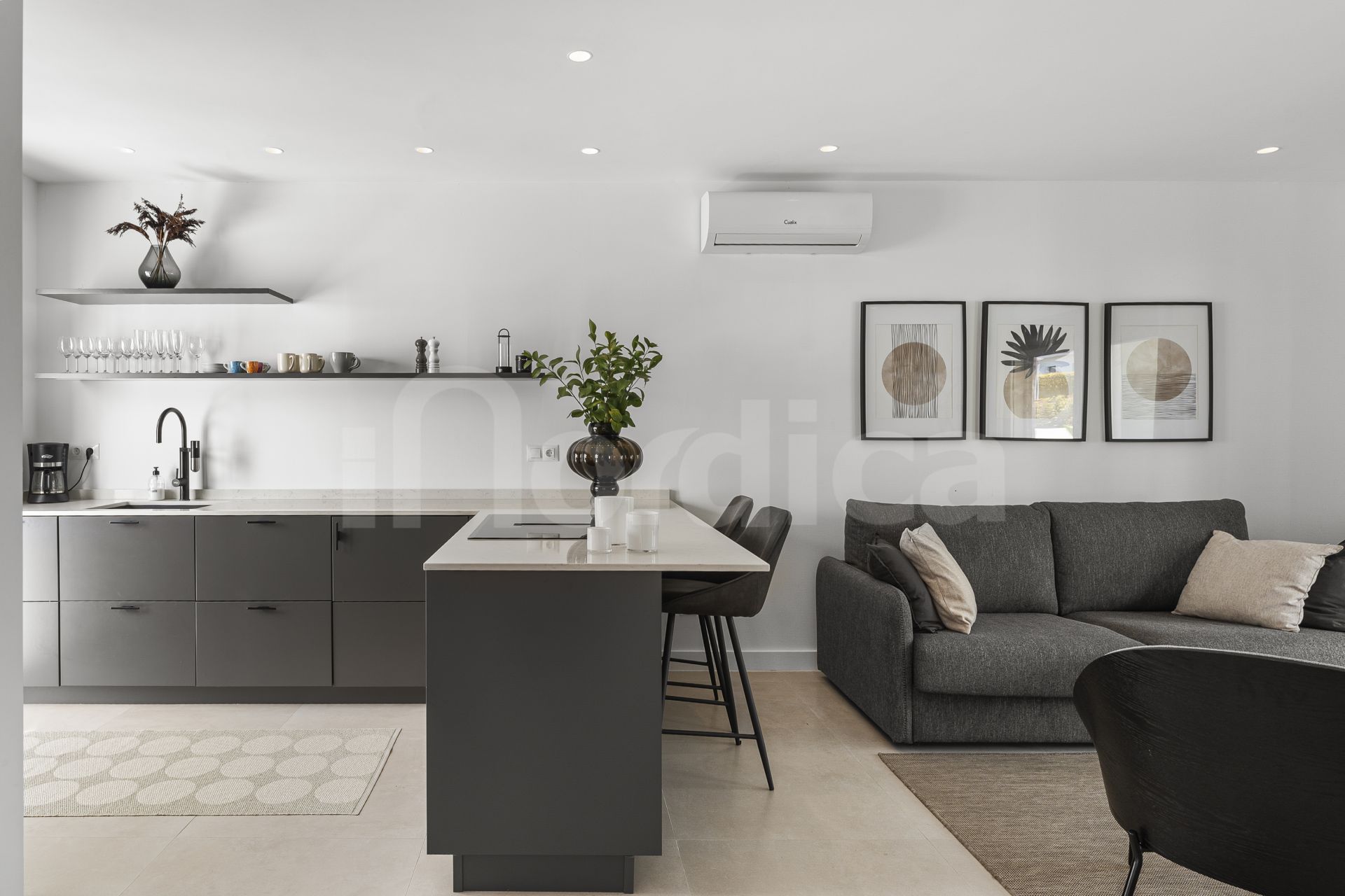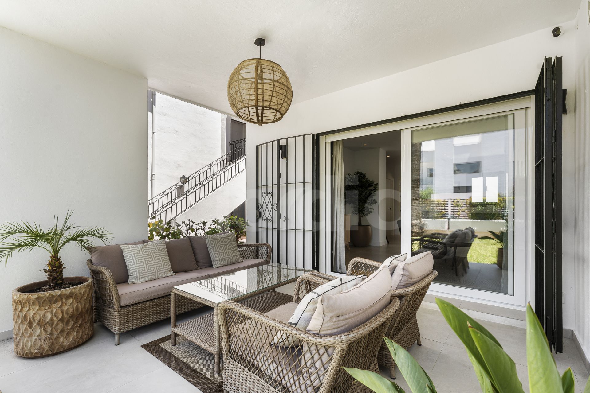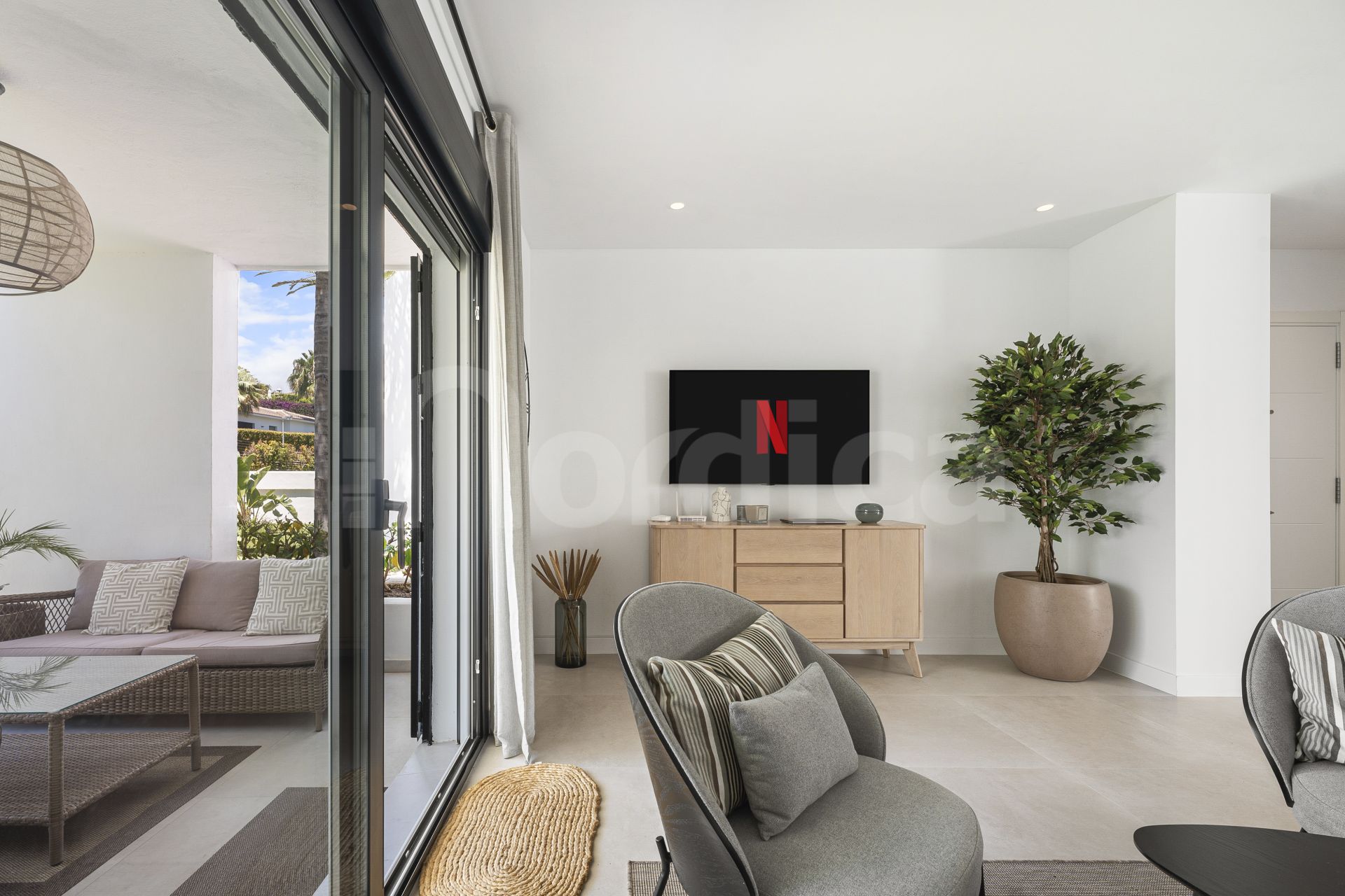 El apartamento ha sido completamente renovado con altos estándares, y cuenta con una cocina de concepto abierto conectada perfectamente con el luminoso salón-comedor. Junto a la cocina, un encantador patio ofrece el espacio ideal para comer al aire libre con una zona de barbacoa, perfecto para disfrutar del cálido clima de Marbella. El salón se abre a una terraza y a la zona ajardinada, creando un ambiente tranquilo y relajante. La propiedad dispone de un dormitorio amplio con armarios empotrados y un baño con ducha a ras de suelo.