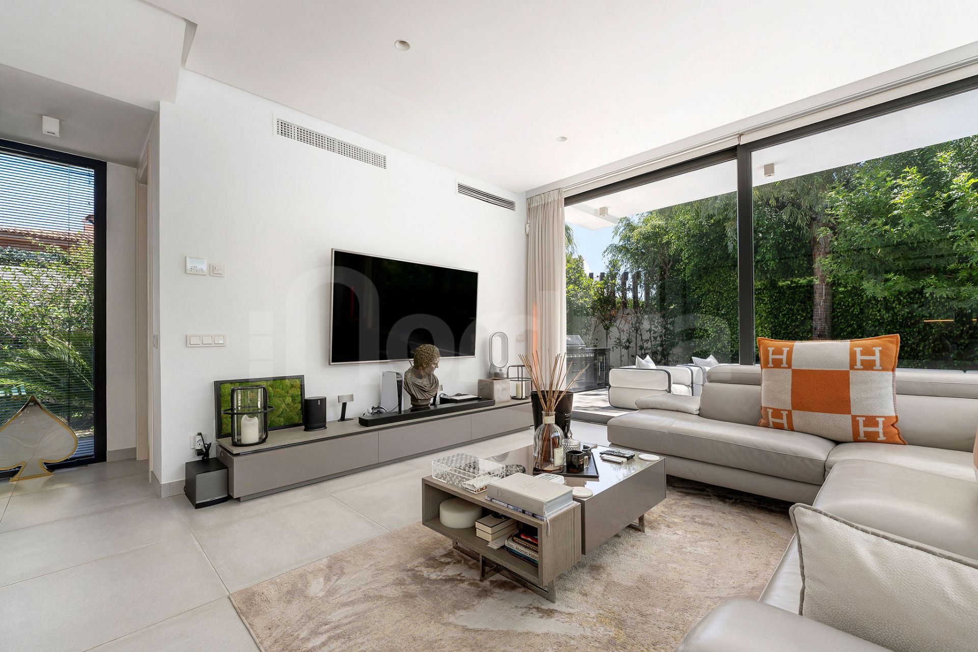 La villa cuenta con 249 m² de espacio interior distribuidos en tres niveles, complementados por 93 m² de terrazas. La planta principal presenta una zona de salón y comedor de concepto abierto con cocina totalmente equipada con electrodomésticos NEFF, que se integra perfectamente con una soleada terraza con barbacoa y piscina climatizada. Los acabados de alta calidad, como suelos de madera noble y piedra natural, realzan la elegancia de la vivienda.