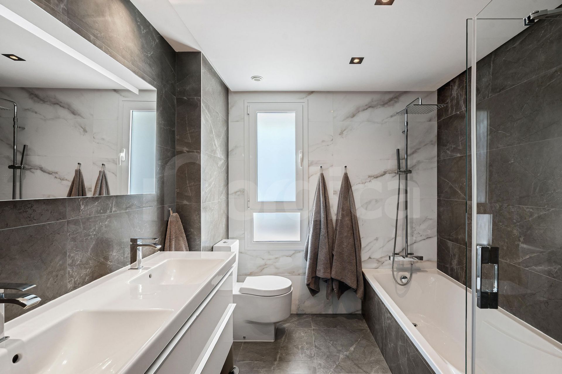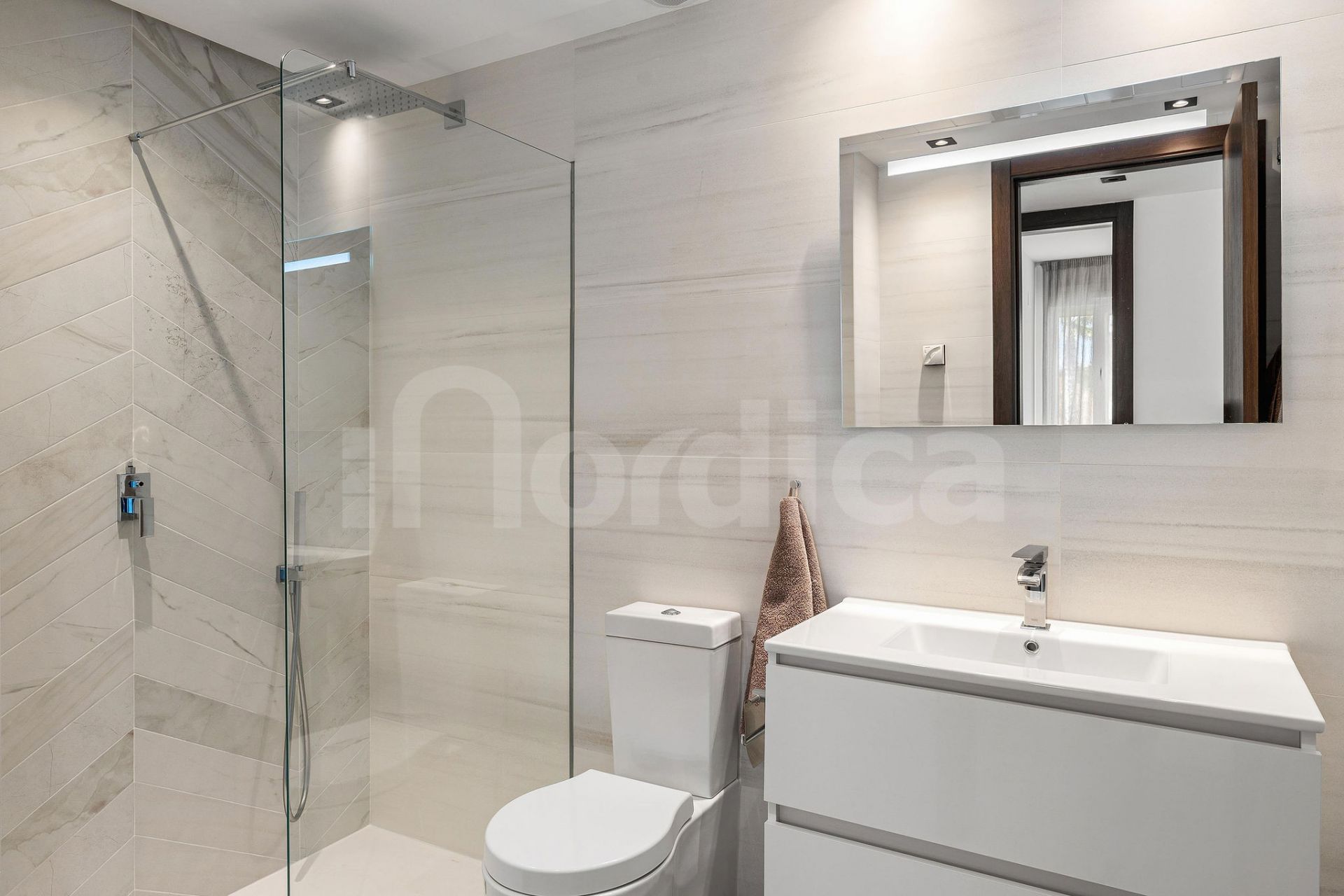 Al entrar en la vivienda, un acogedor vestíbulo le dirige en dos direcciones. A la izquierda, encontrará dos amplios dormitorios dobles que comparten un baño moderno con ducha a ras de suelo, que también funciona como aseo de invitados.
