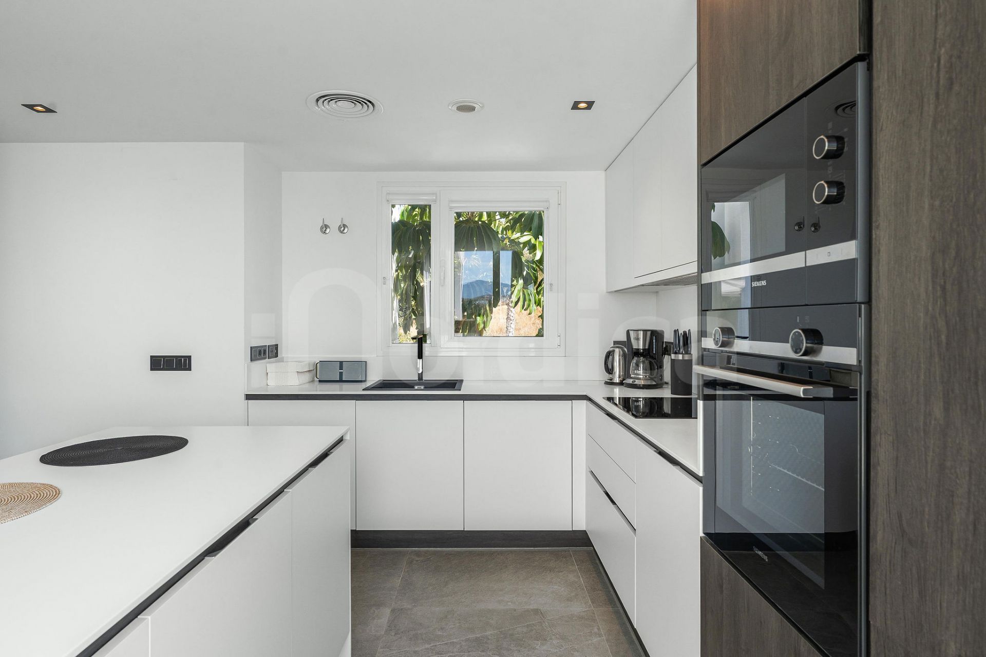 De frente, el vestíbulo se abre a un luminoso salón con cocina de concepto abierto, un espacio bañado por la luz natural gracias a ventanales en varias direcciones. La terraza orientada al oeste se integra perfectamente con el salón, ofreciendo magníficas vistas panorámicas al mar, al campo de golf y a las montañas circundantes, ideal para disfrutar de atardeceres y cenas al aire libre.