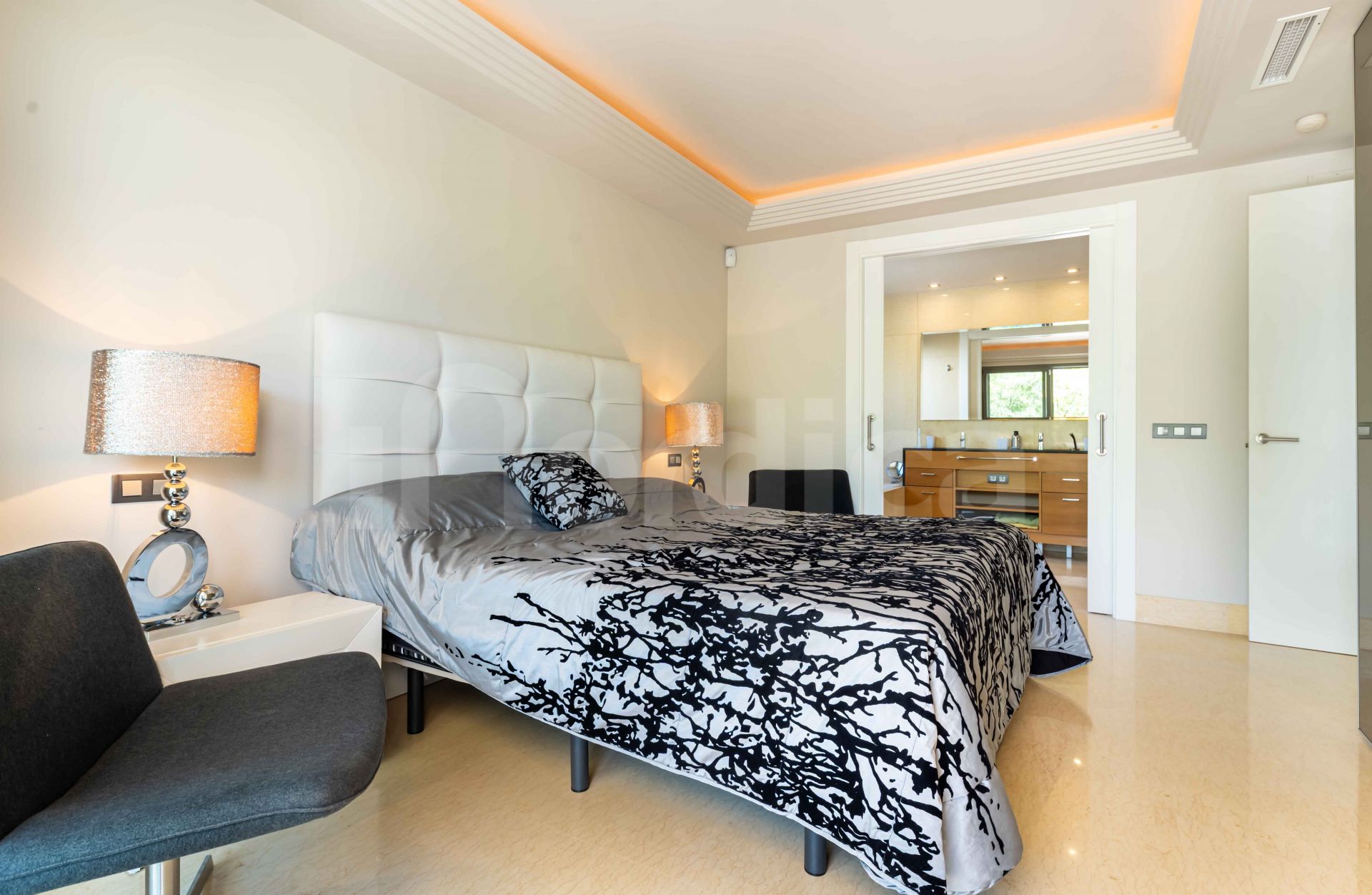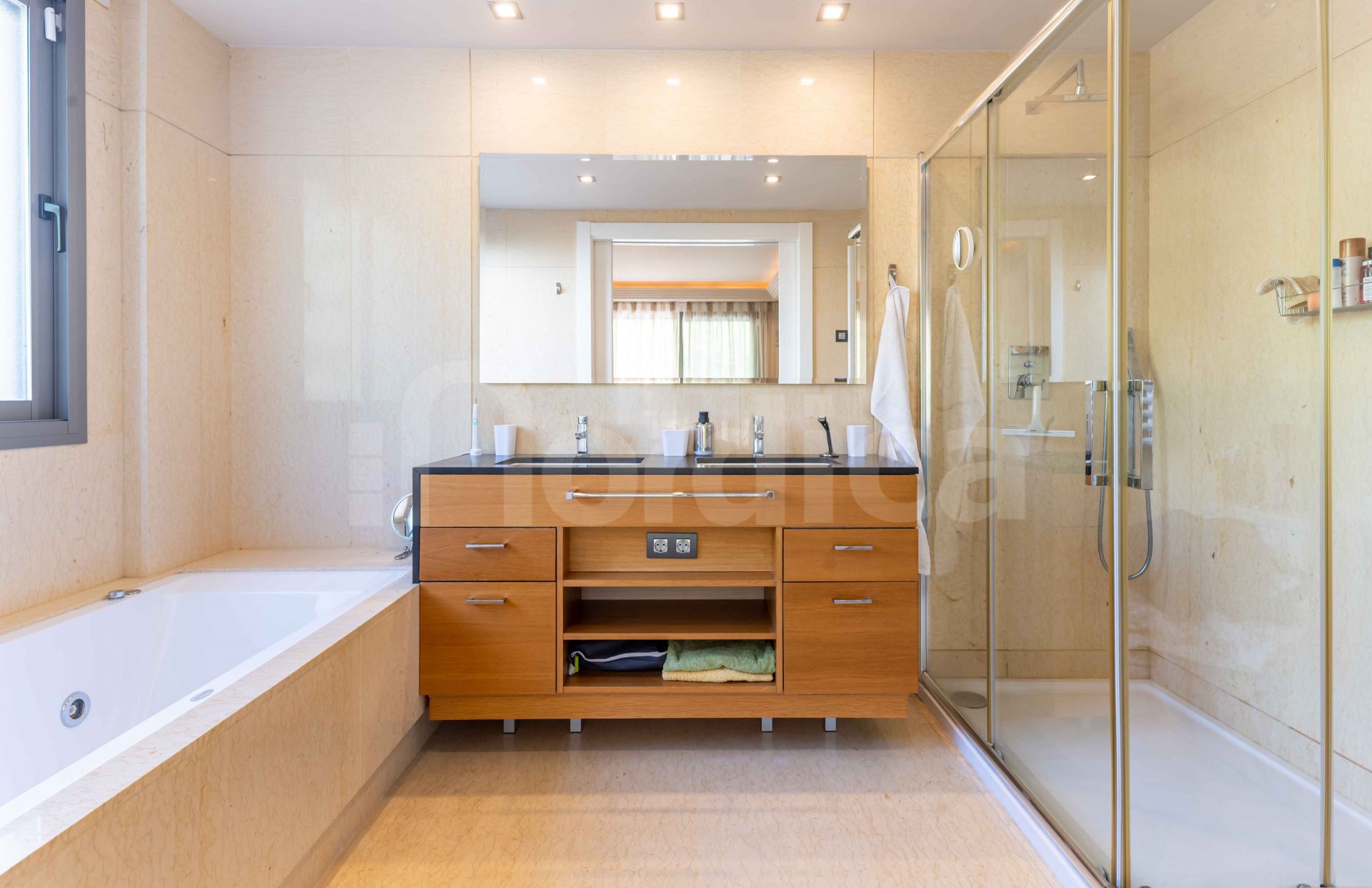 Entre las características contemporáneas se incluyen un sistema de aire acondicionado frío/calor con controles independientes en cada estancia, la opción de instalar calefacción por suelo radiante en los baños y la posibilidad de añadir iluminación indirecta para crear un ambiente suave y acogedor. Las persianas eléctricas pueden operarse tanto de forma centralizada como individual. Para mayor seguridad y tranquilidad, la propiedad está equipada con detectores de humo y agua, sistema de alarma, caja fuerte empotrada y armarios empotrados. El baño principal ofrece un toque de lujo tipo spa, con ducha independiente y bañera de hidromasaje Jacuzzi.