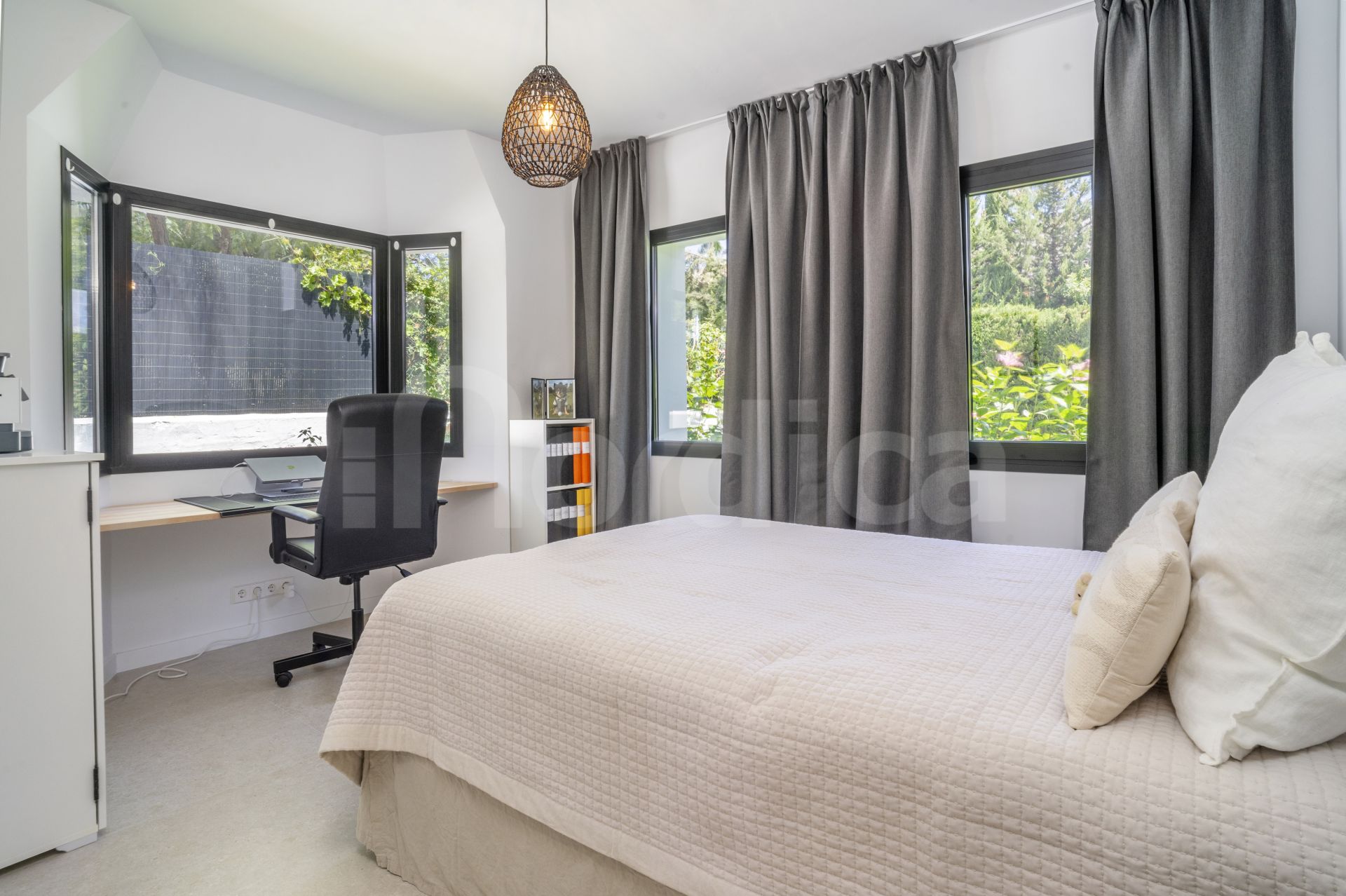 Al entrar en la villa, le recibe un amplio espacio de concepto abierto que conecta perfectamente la cocina, el comedor y el salón. La cocina moderna está totalmente equipada y diseñada con elegancia, integrándose a la perfección con el salón, que cuenta con una acogedora chimenea. Grandes ventanales y acceso directo a la terraza inundan el interior de luz natural, creando un ambiente cálido y acogedor. En esta planta también hay un dormitorio y un baño completo, ideal para invitados o familiares que prefieran vivir en una sola planta. Los espacios exteriores ofrecen terrazas cubiertas y descubiertas, un jardín privado y una refrescante piscina, perfectos para disfrutar del sol de Marbella durante todo el año.