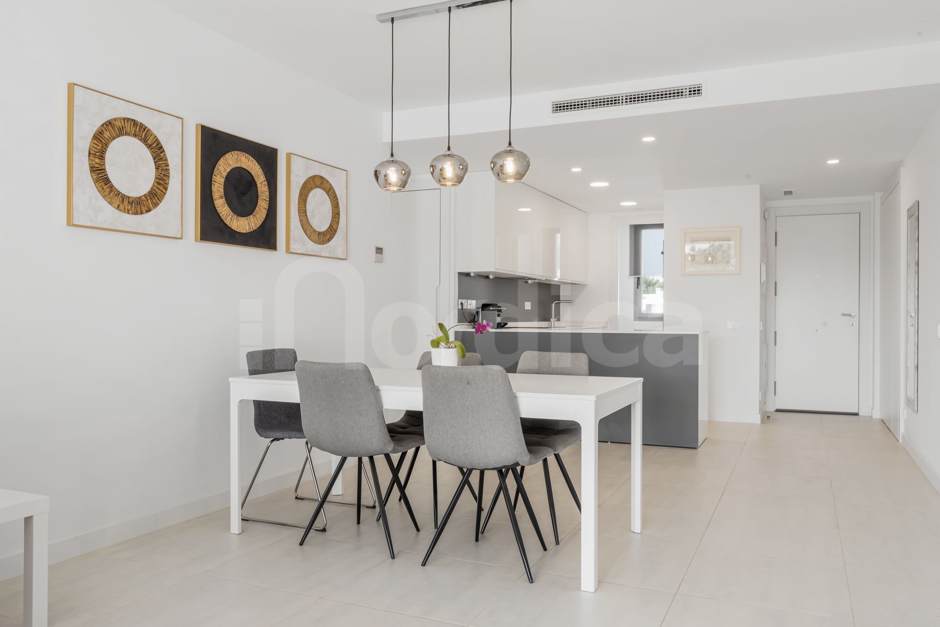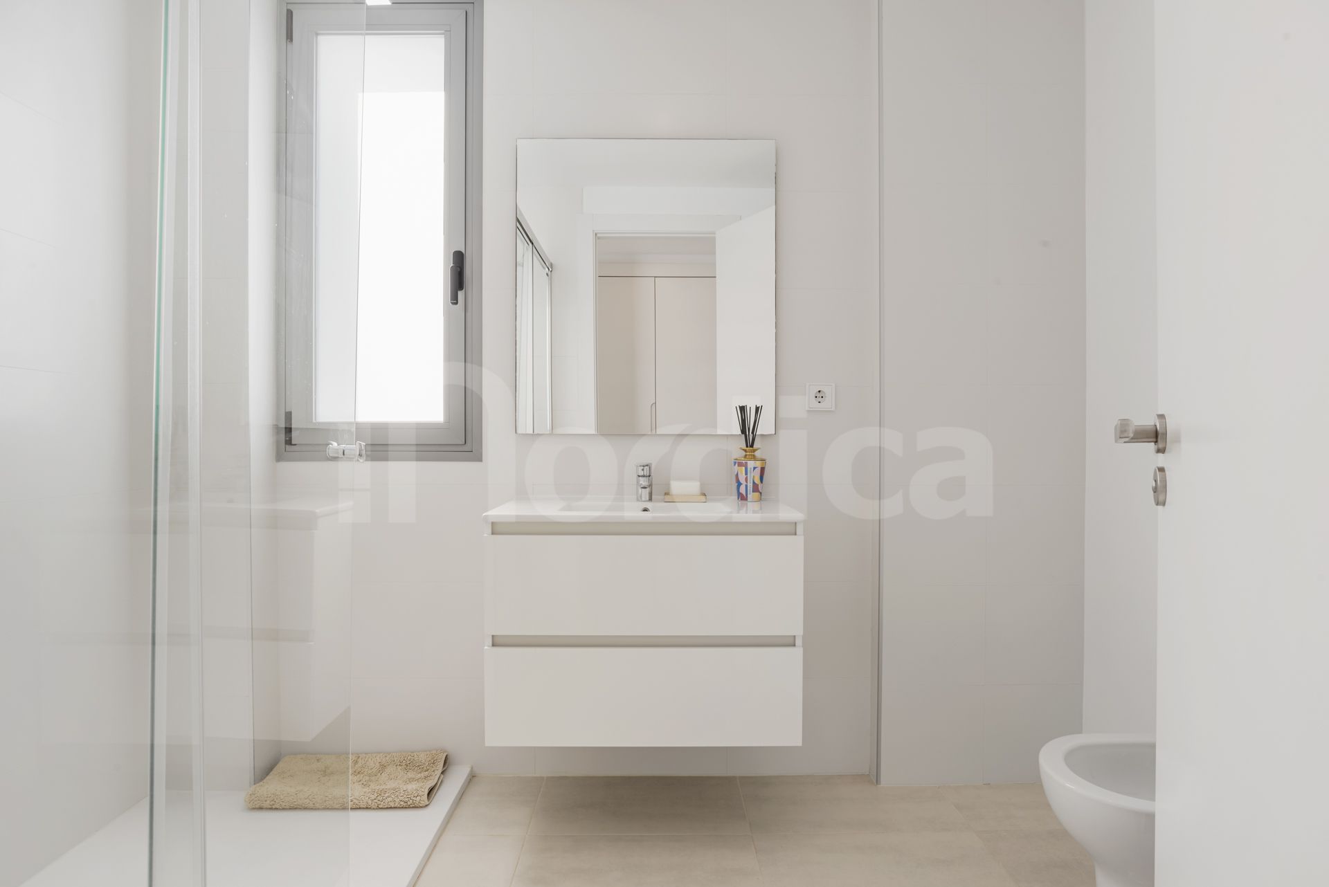 El dormitorio principal cuenta con baño en suite. Un segundo dormitorio de invitados se complementa con un baño independiente. Tanto desde el salón como desde el dormitorio principal se accede directamente a una amplia terraza parcialmente cubierta.