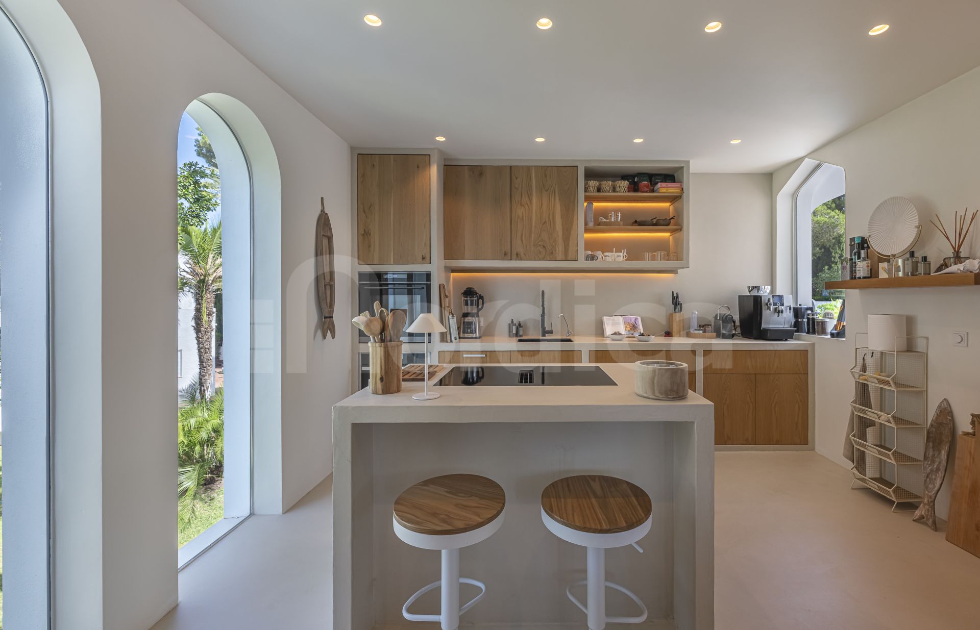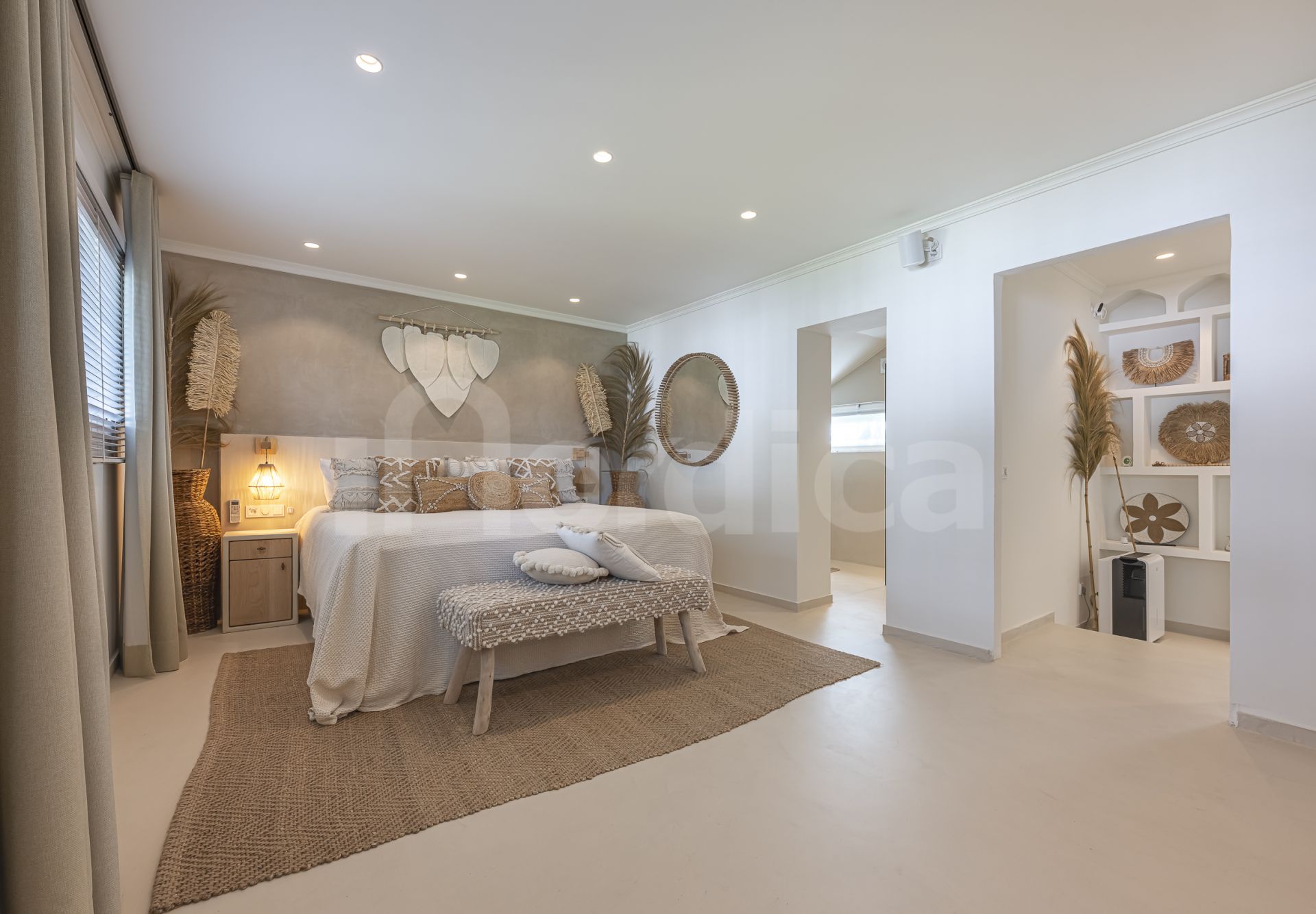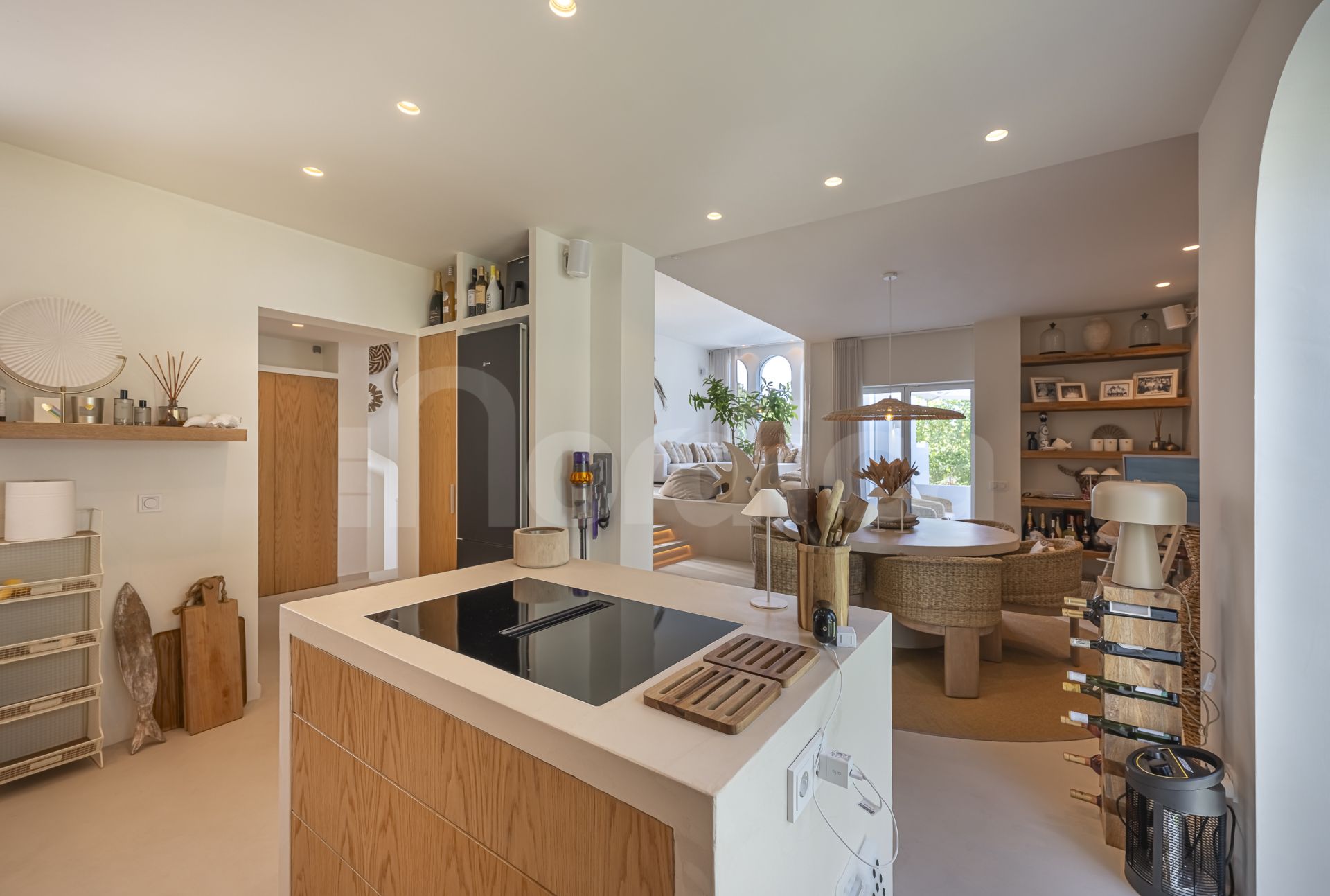 Cette villa exceptionnelle, rénovée par les propriétaires actuels selon les normes les plus élevées en 2023, présente un design méditerranéen moderne raffiné, imprégné d’une touche Boho Chic. Les intérieurs dégagent une élégance discrète, mêlant des accents chaleureux en bois, des surfaces en céramique élégantes et des détails luxueux pour créer une atmosphère accueillante. Le vaste espace de vie décloisonné et la cuisine s’ouvrent harmonieusement sur les espaces extérieurs, créant une connexion fluide entre le confort intérieur et la vie en plein air.