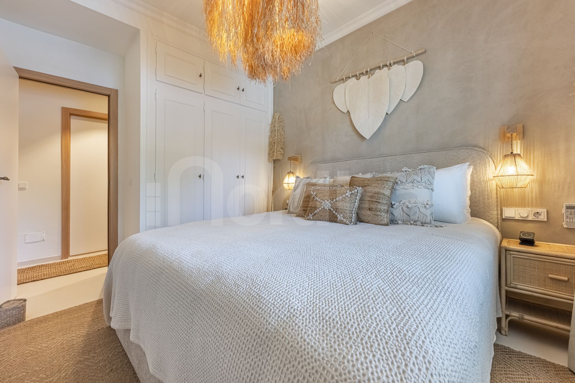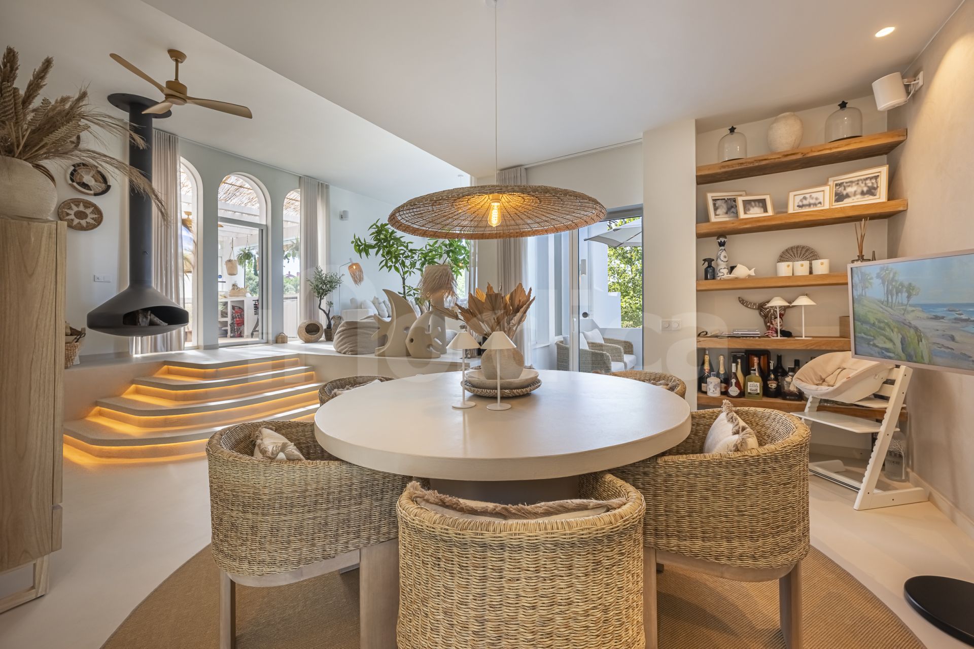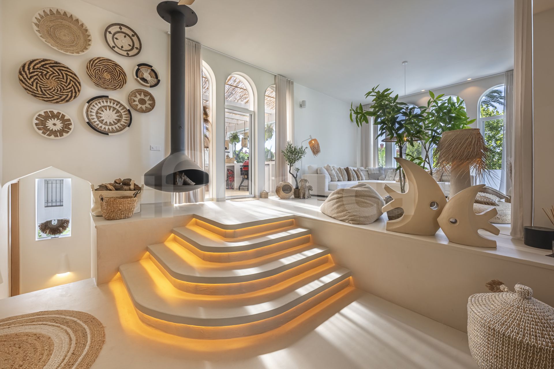 Cette villa exceptionnelle, rénovée par les propriétaires actuels selon les normes les plus élevées en 2023, présente un design méditerranéen moderne raffiné, imprégné d’une touche Boho Chic. Les intérieurs dégagent une élégance discrète, mêlant des accents chaleureux en bois, des surfaces en céramique élégantes et des détails luxueux pour créer une atmosphère accueillante. Le vaste espace de vie décloisonné et la cuisine s’ouvrent harmonieusement sur les espaces extérieurs, créant une connexion fluide entre le confort intérieur et la vie en plein air.