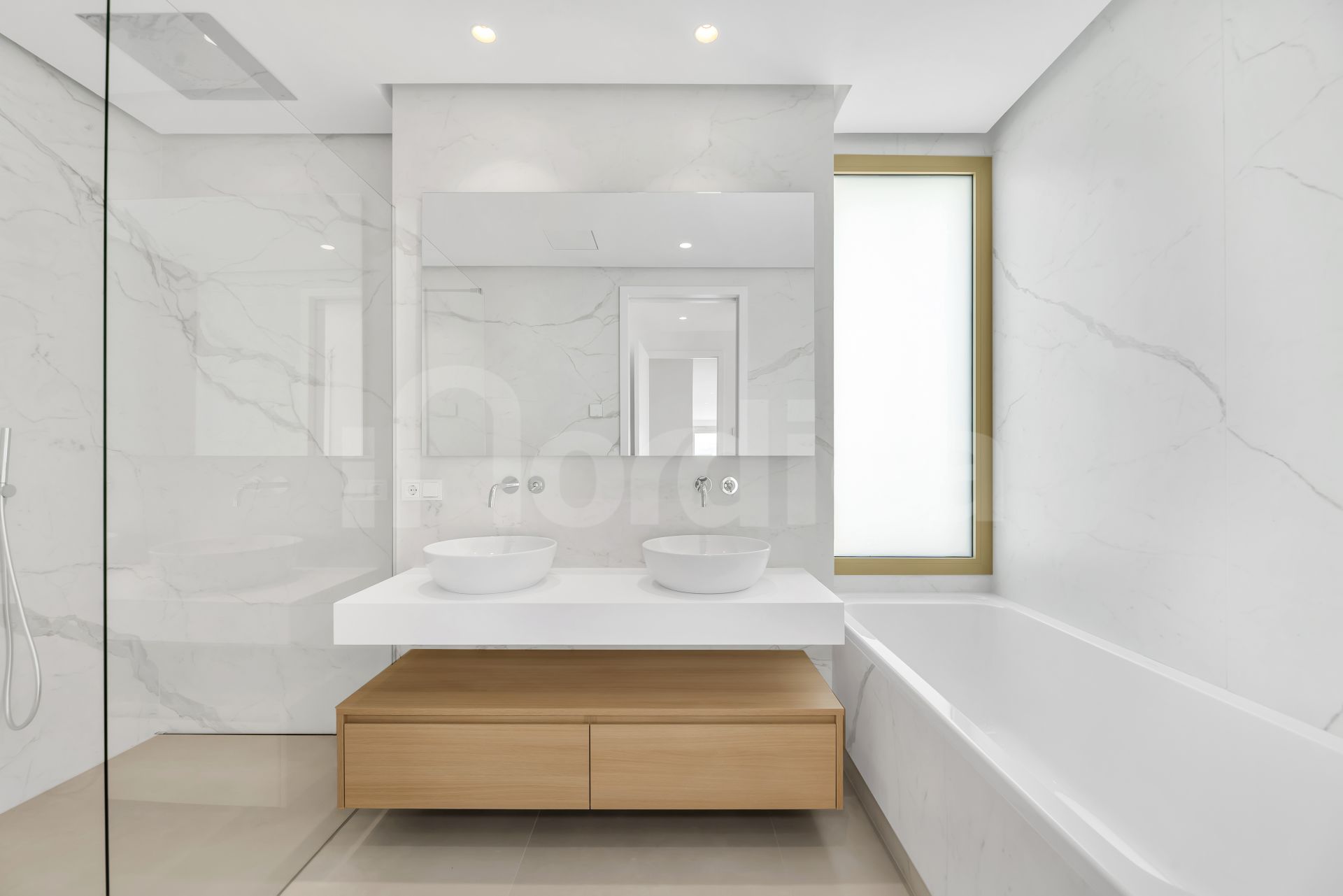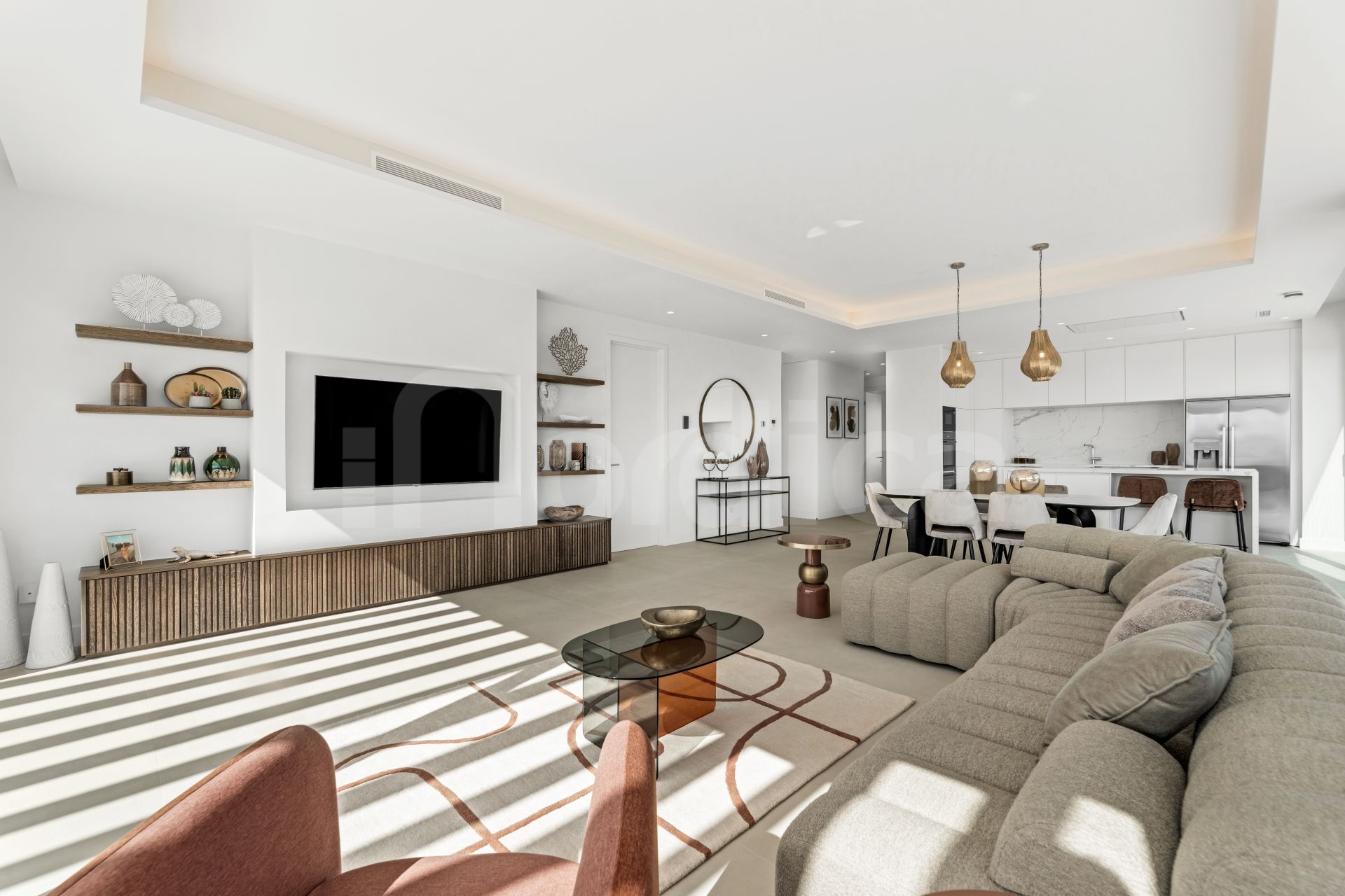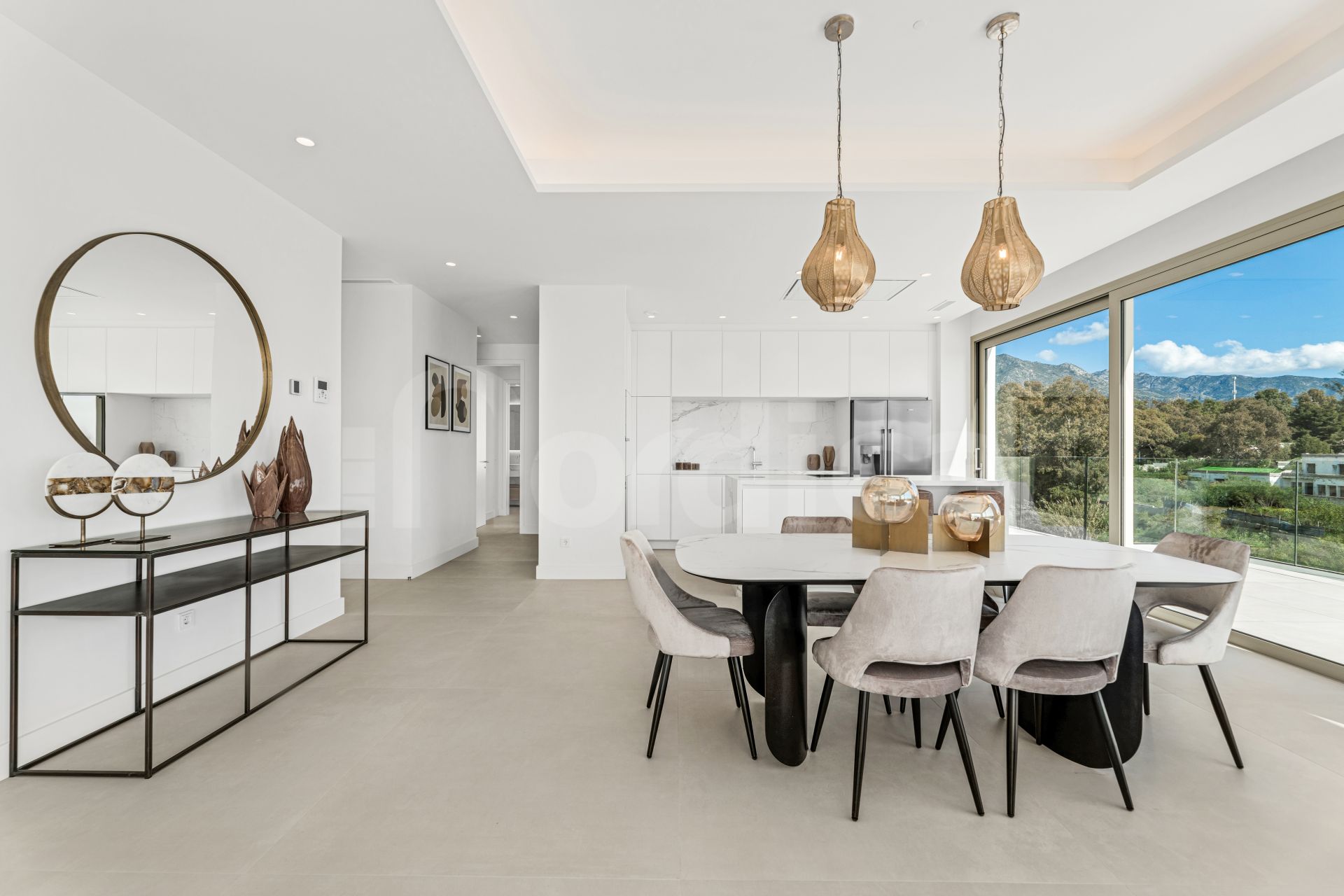 Vous accédez à cette résidence récemment achevée par un ascenseur privé pour découvrir un vaste espace de vie et de réception baigné de lumière naturelle grâce aux fenêtres orientées plein sud, offrant également de magnifiques vues sur la mer. Le premier niveau s’étend sur 146 m² de luxe intérieur, comprenant trois chambres somptueuses, chacune avec sa propre salle de bains attenante et terrasse privée. De plus, une grande terrasse prolonge l’espace de vie principal, idéale pour recevoir ou se détendre.