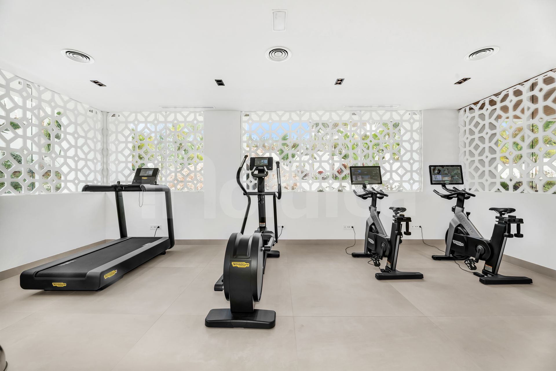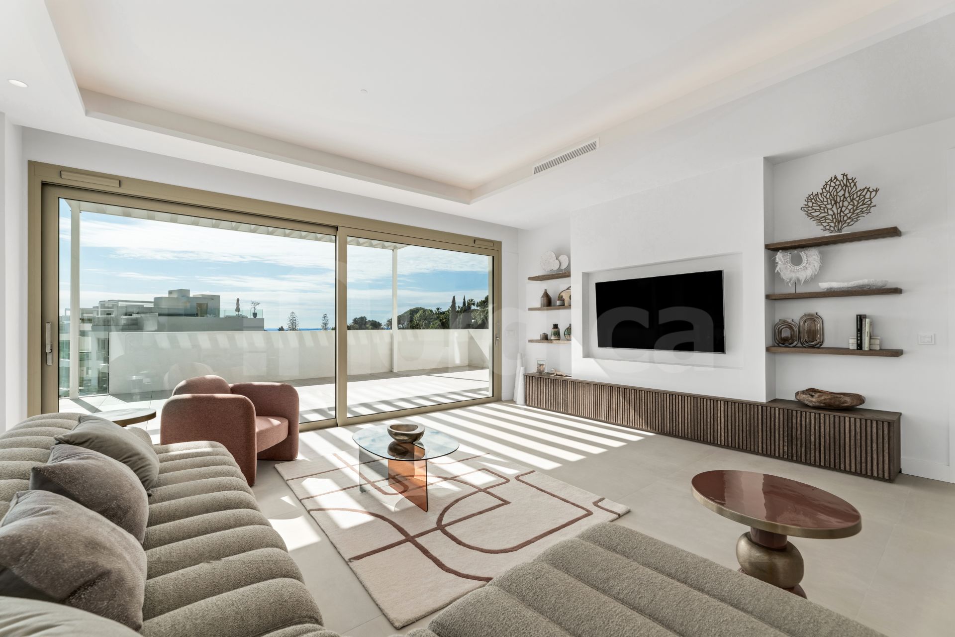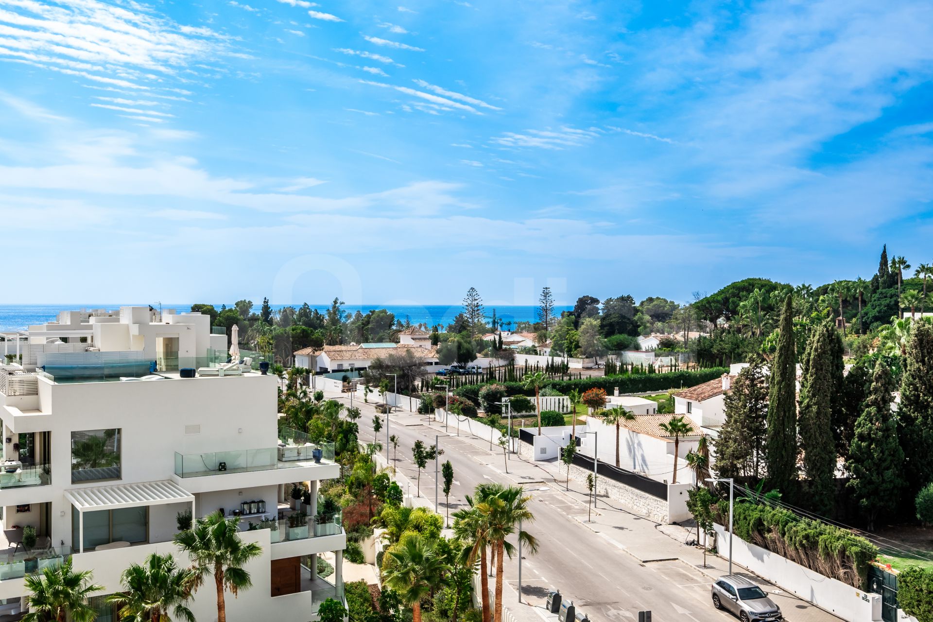 Le solarium à l’étage supérieur sublime la propriété avec des installations extérieures haut de gamme, incluant une cuisine extérieure, un élégant espace détente et une grande piscine à débordement. Ces prestations s’inscrivent dans le cadre prestigieux de la Golden Mile et de la mer Méditerranée.