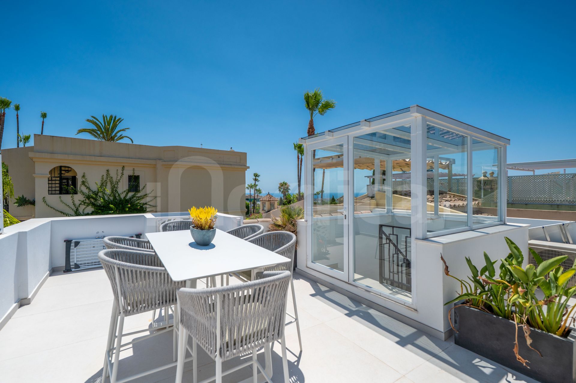 Le solarium sur le toit constitue un véritable atout, offrant des vues panoramiques ; on y accède par un escalier intérieur, garantissant un espace parfait pour en profiter toute l’année.