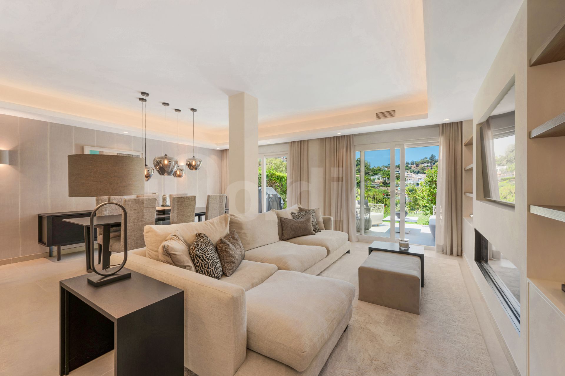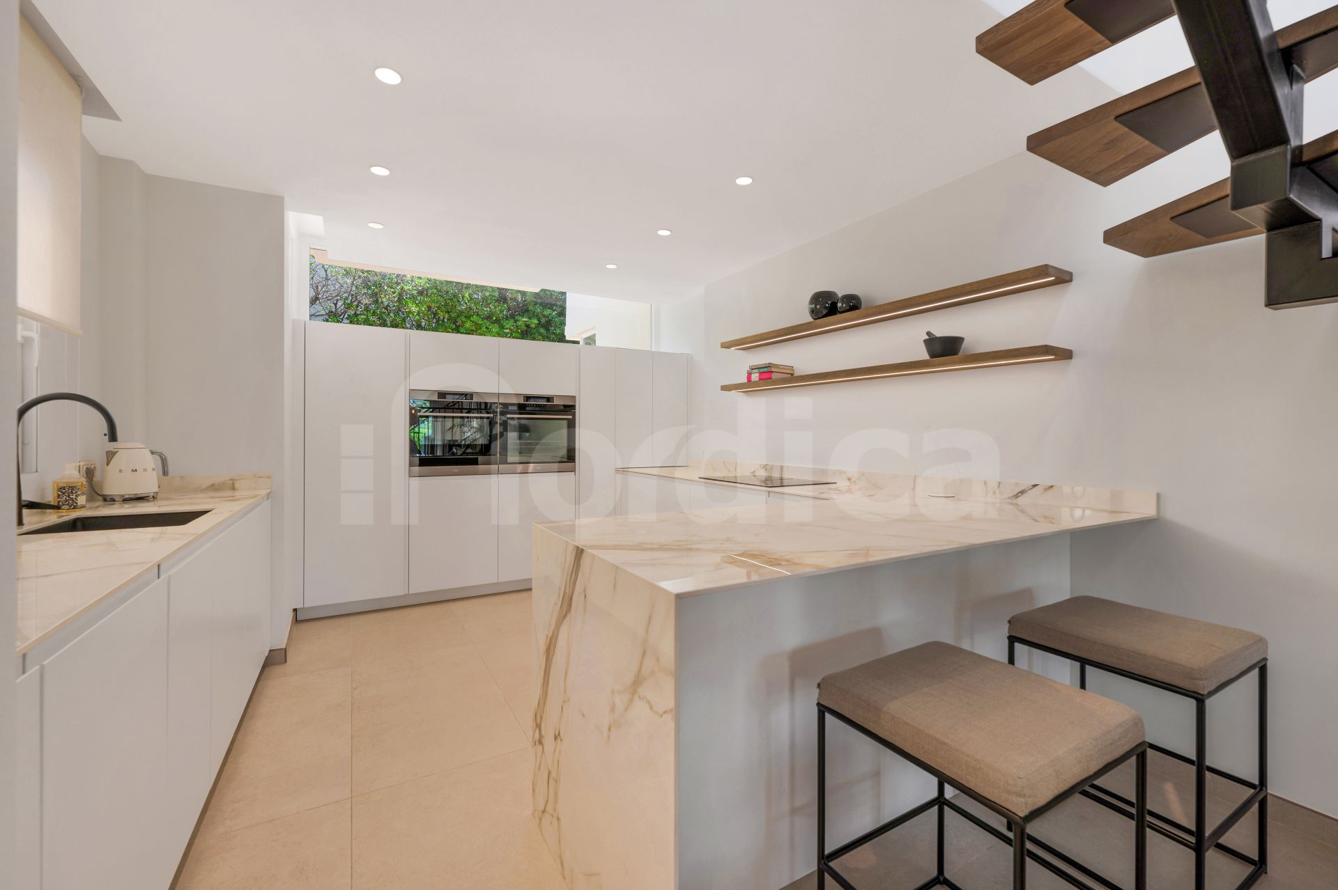 Répartie sur trois niveaux, la propriété offre un espace de vie lumineux en plan ouvert avec une cuisine sur mesure, des appareils électroménagers haut de gamme, une cave à vin et une cheminée. De grandes portes coulissantes s’ouvrent sur une terrasse privée avec jardin.