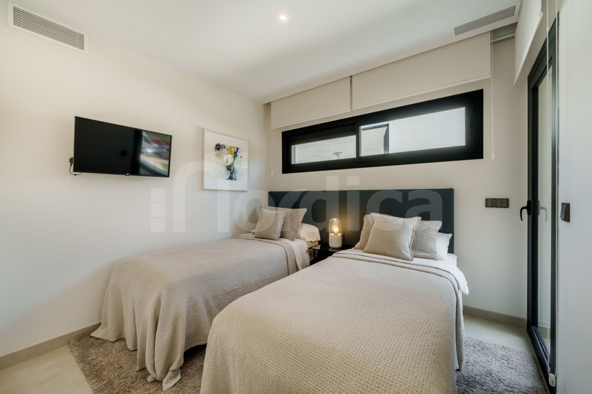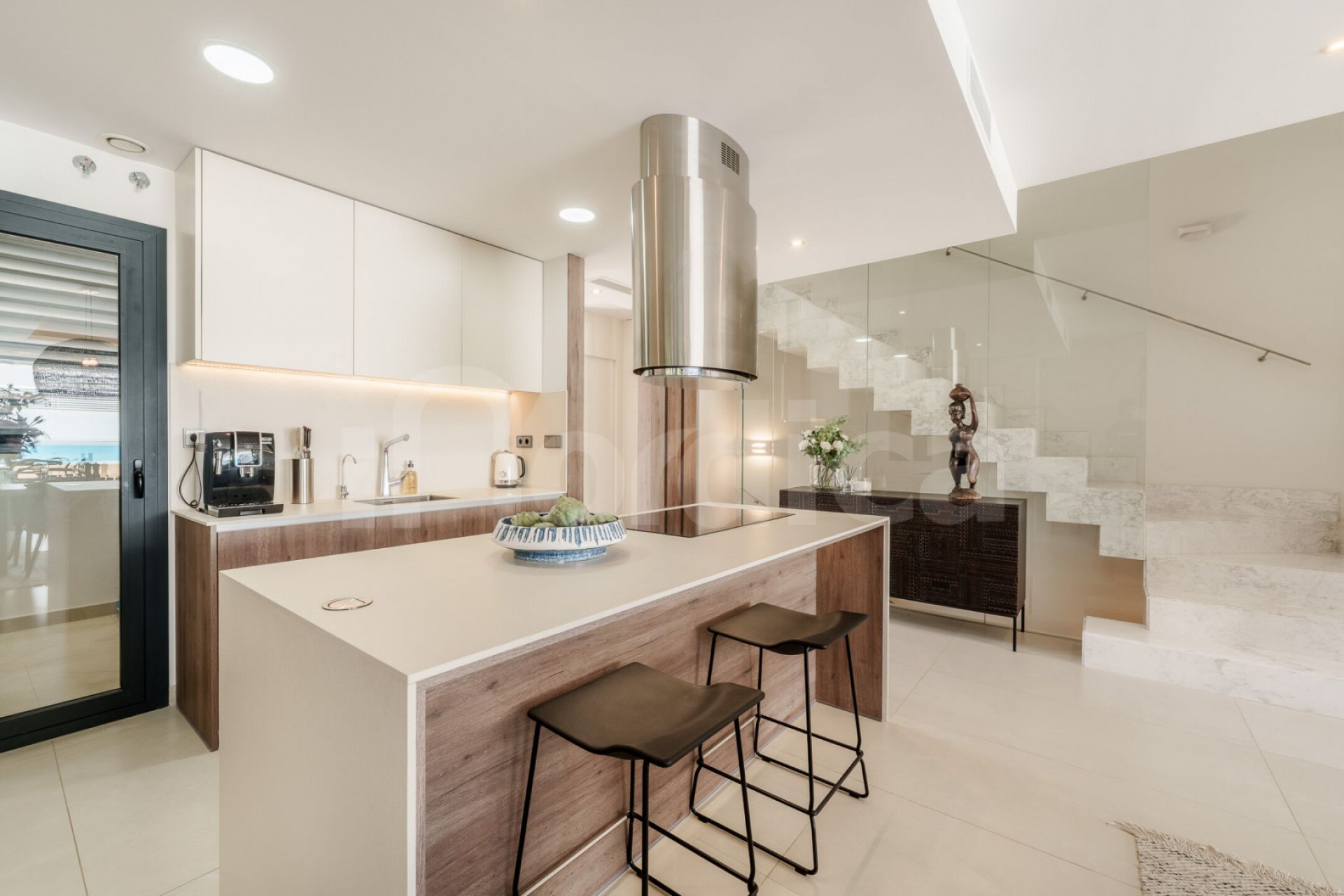 La propriété dispose d’un vaste espace de vie et salle à manger décloisonné avec accès direct à la terrasse et à la piscine, d’une cuisine entièrement équipée, ainsi que d’un niveau inférieur avec un salon TV cosy idéal pour se détendre. Le solarium sur le toit offre un espace de vie extérieur supplémentaire, avec jacuzzi, parfait pour recevoir ou profiter du climat de Marbella.