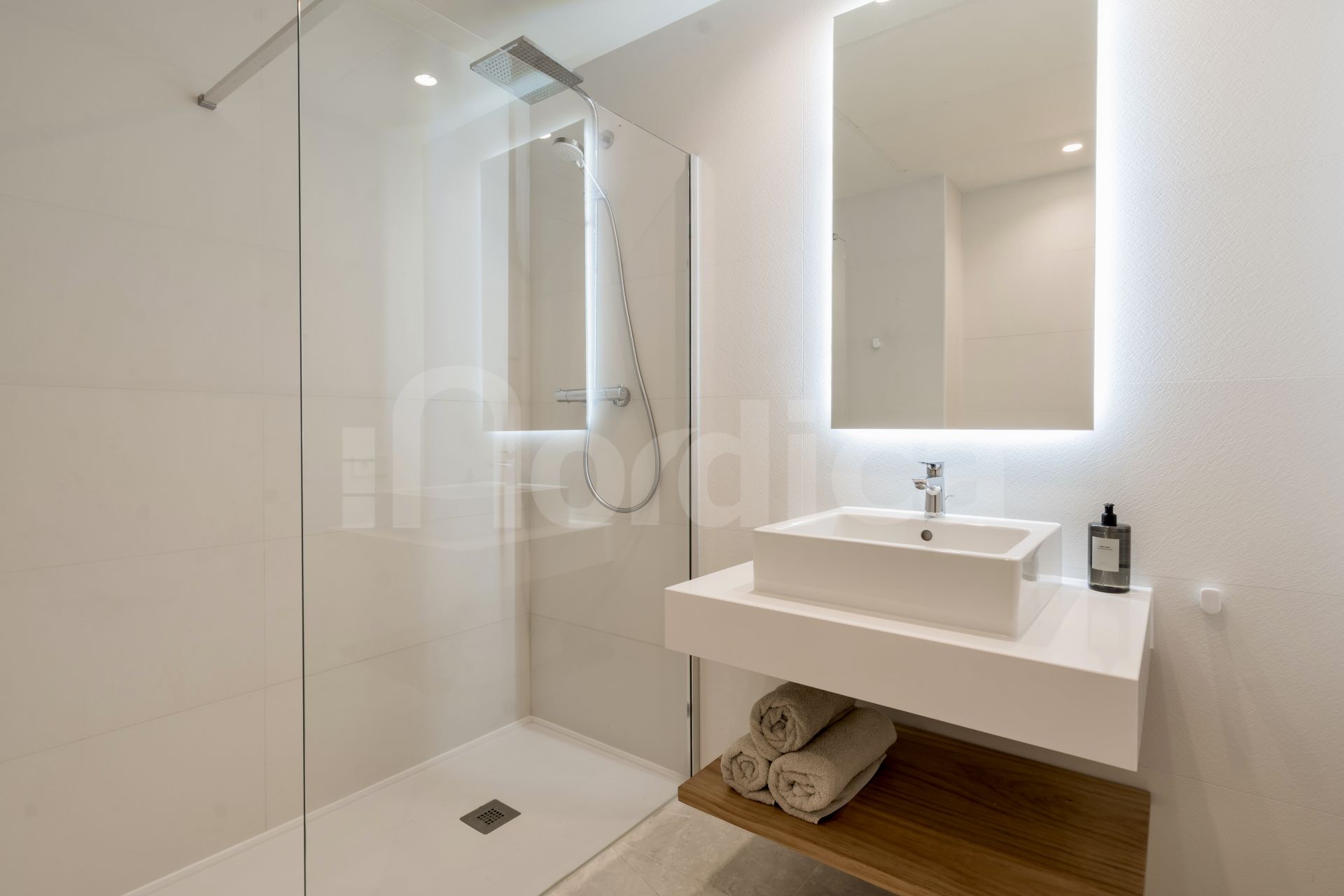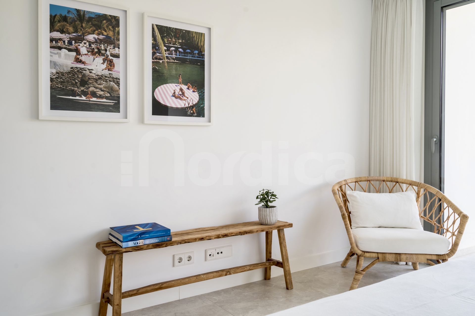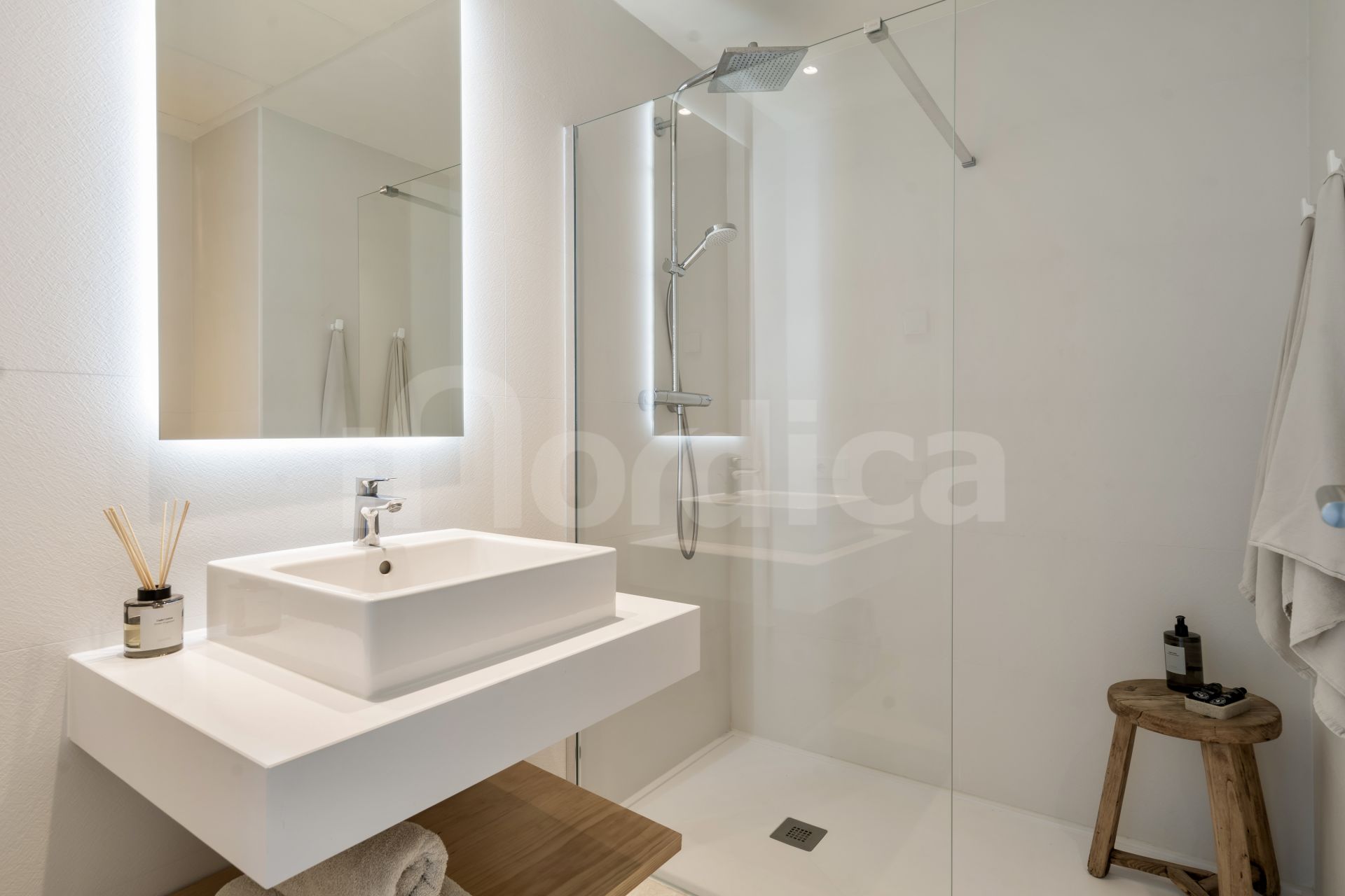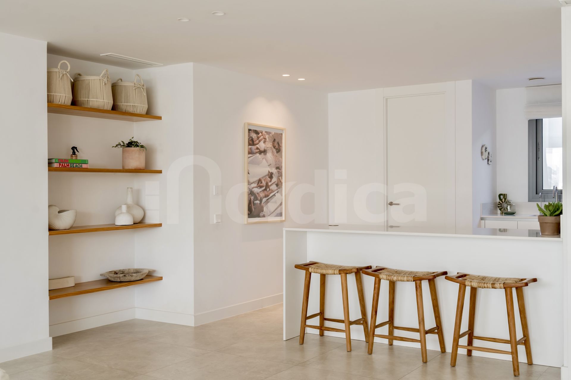 À l’intérieur, vous découvrirez une cuisine ouverte et un espace de vie qui se connectent harmonieusement à l’extérieur. L’appartement dispose de quatre chambres et trois salles de bains, dont deux en suite.
